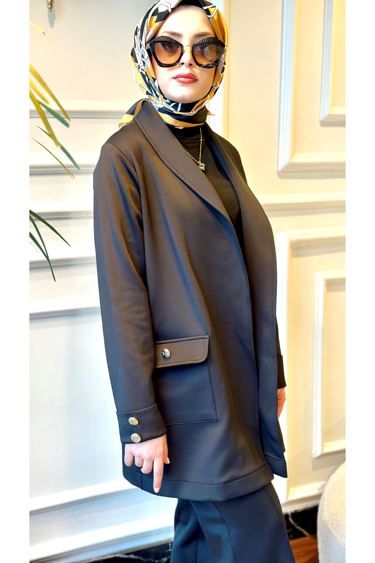 SHAWL COLLAR SLEEVE JACKET COLOR: BLACK AND KHAKI SIZE: 1-2-3 SHAPE IS WITH A BELTED PRODUCT LENGTH: 73 CM