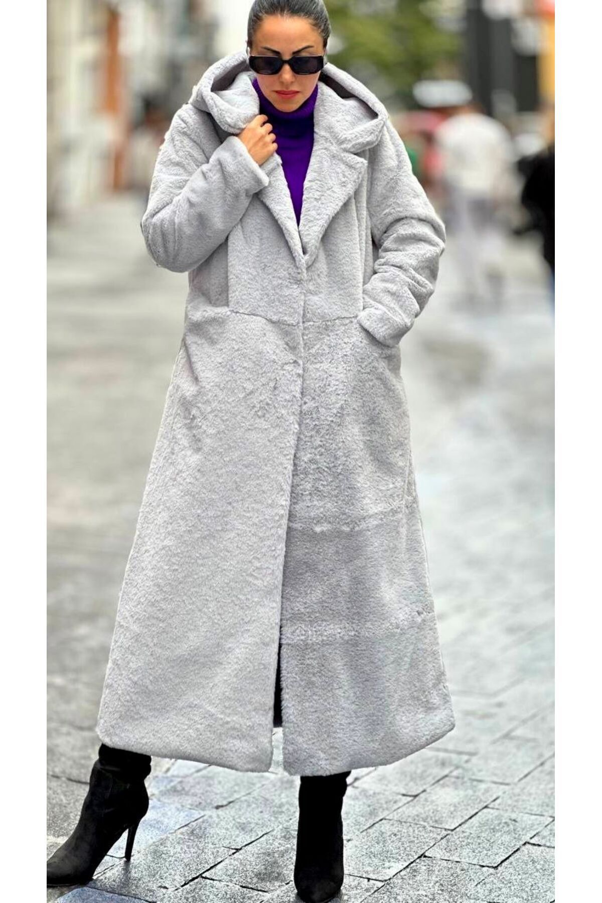 COAT COLOR: GRAY SIZE: STD PRODUCT LENGTH: 121 CM IT IS HOODED, THERE ARE 2 POCKETS ON THE FRONT. It has a purple inner lining without a closure. Fabric: plush