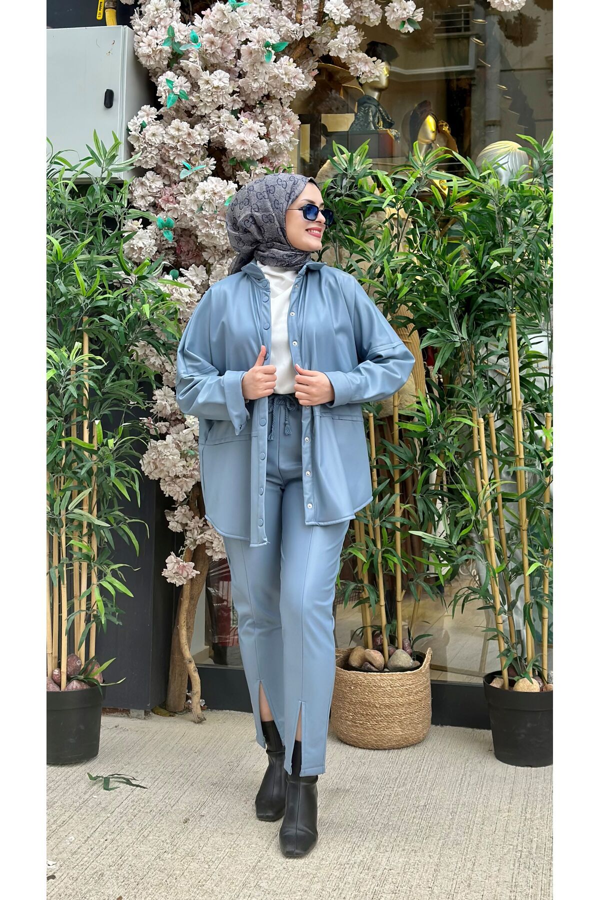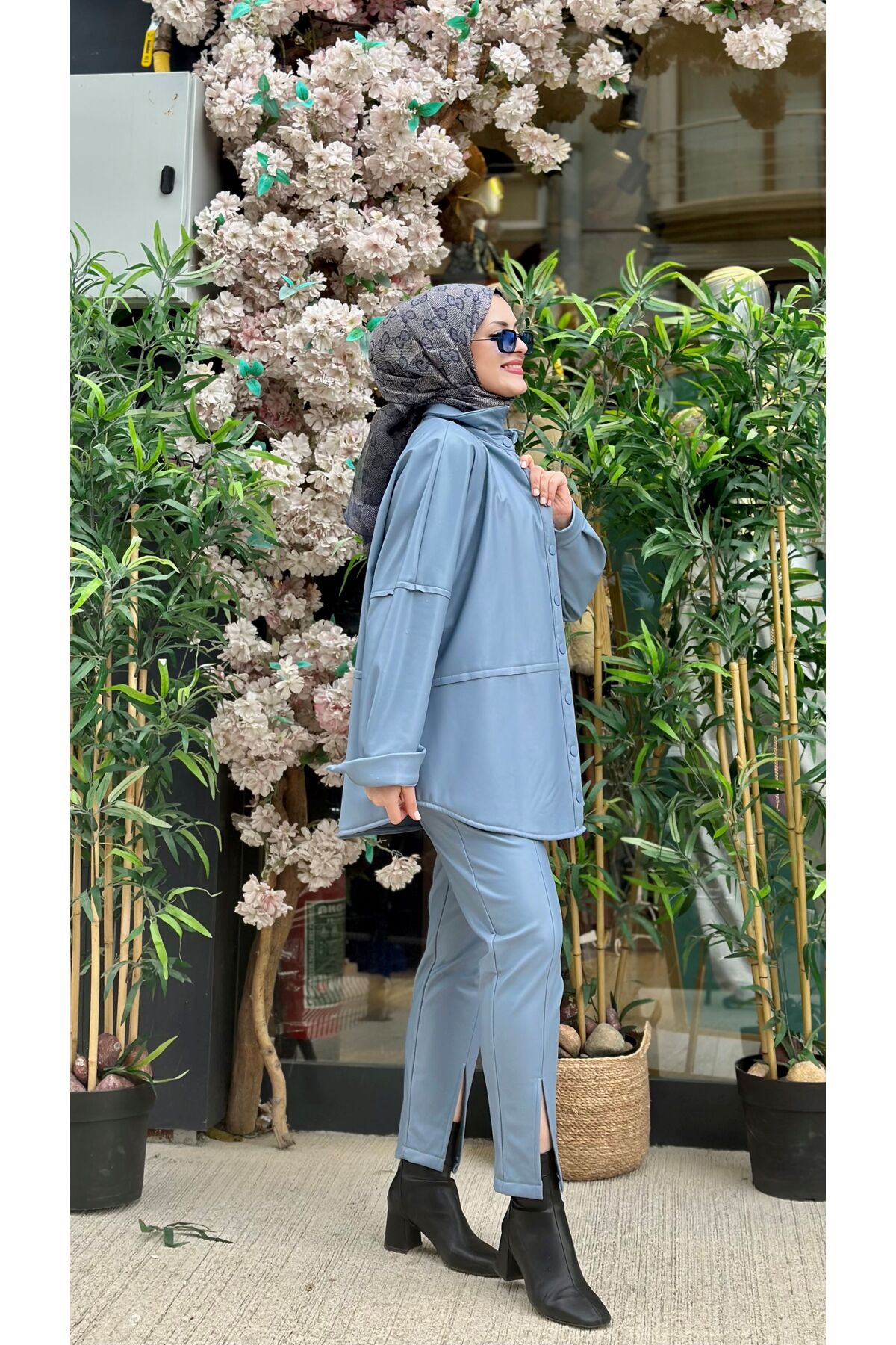 ARTIFICIAL LEATHER TROUSERS COLOR: BLUE SIZE: PANTS SIZE S PRODUCT LENGTH PANTS: 96 CM THE PANTS HAVE A SLEEP DETAIL ON THE FRONT AND THE WAIST IS ELASTIC. THE INSIDE OF THE SUIT IS NUBUCK.