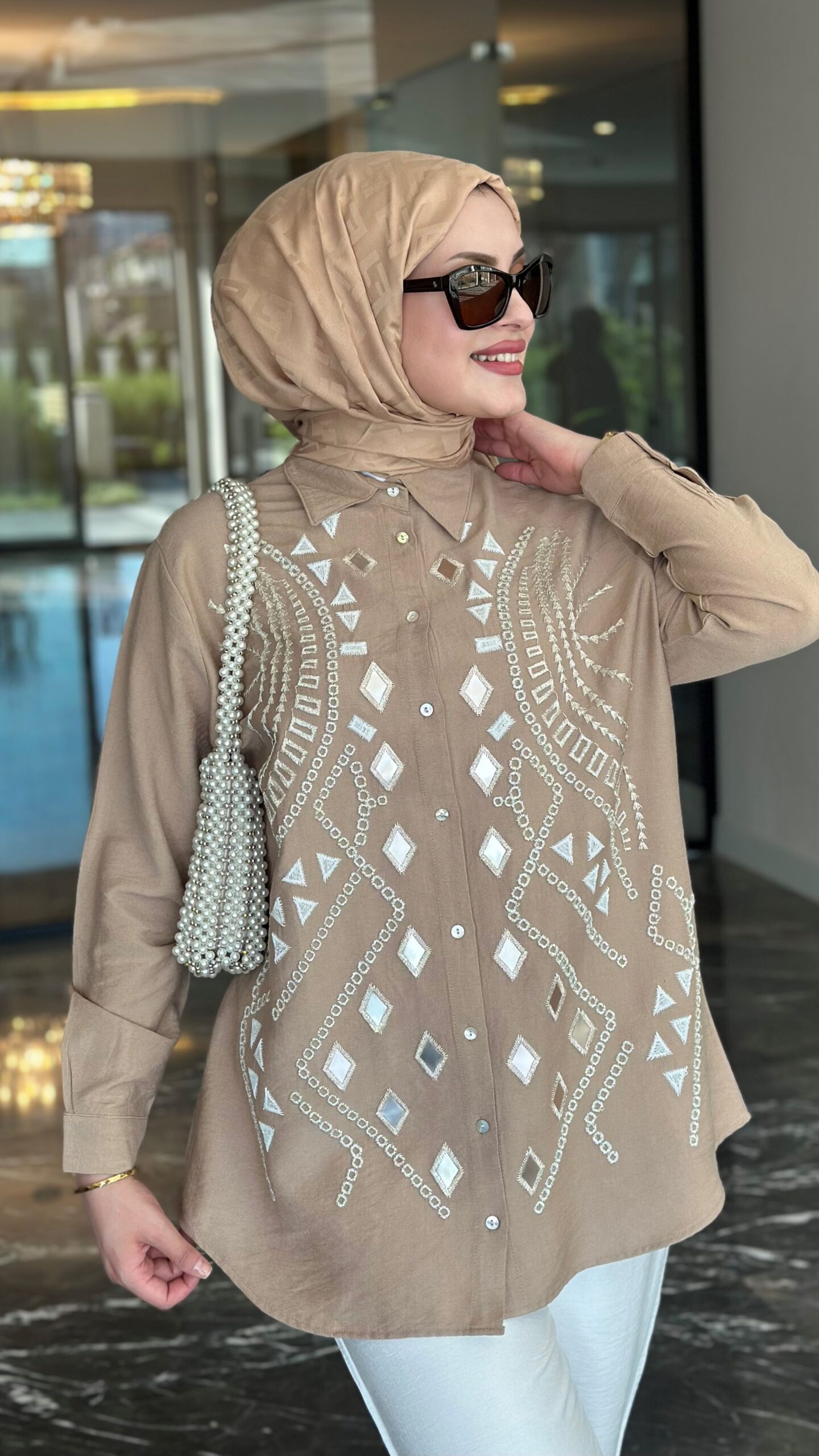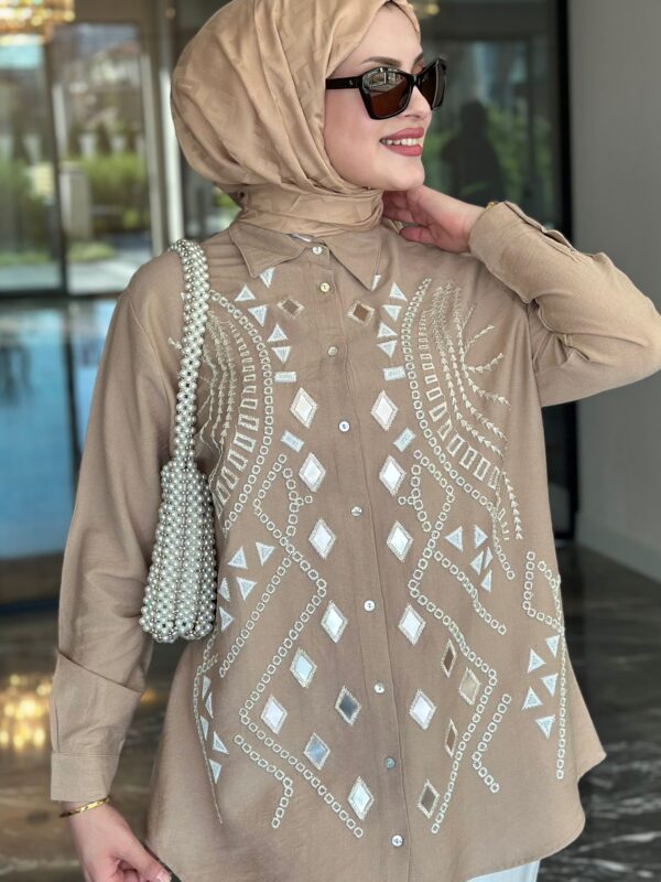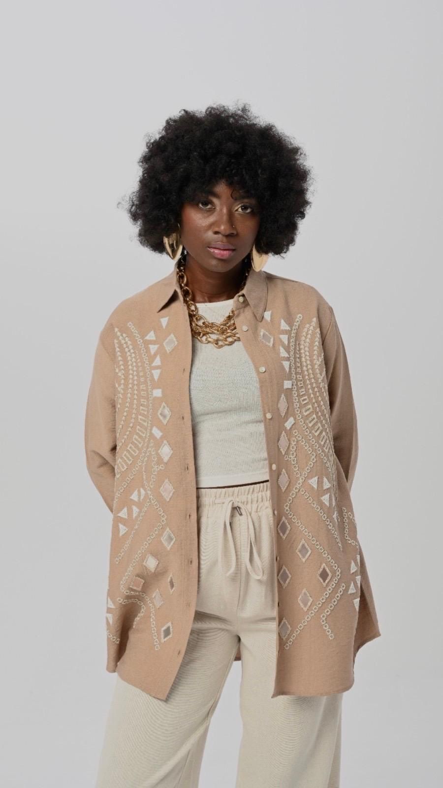 COLOR: BEIGE PRODUCT LENGTH: FRONT LENGTH: 77 CM BACK LENGTH: 79 CM EMBROIDERED EMBROIDERED OVERSIZE MOLD AND WITHOUT POCKET SHIRT COLLAR IS BUTTON CLOSED, FABRIC: 85% VISCON,