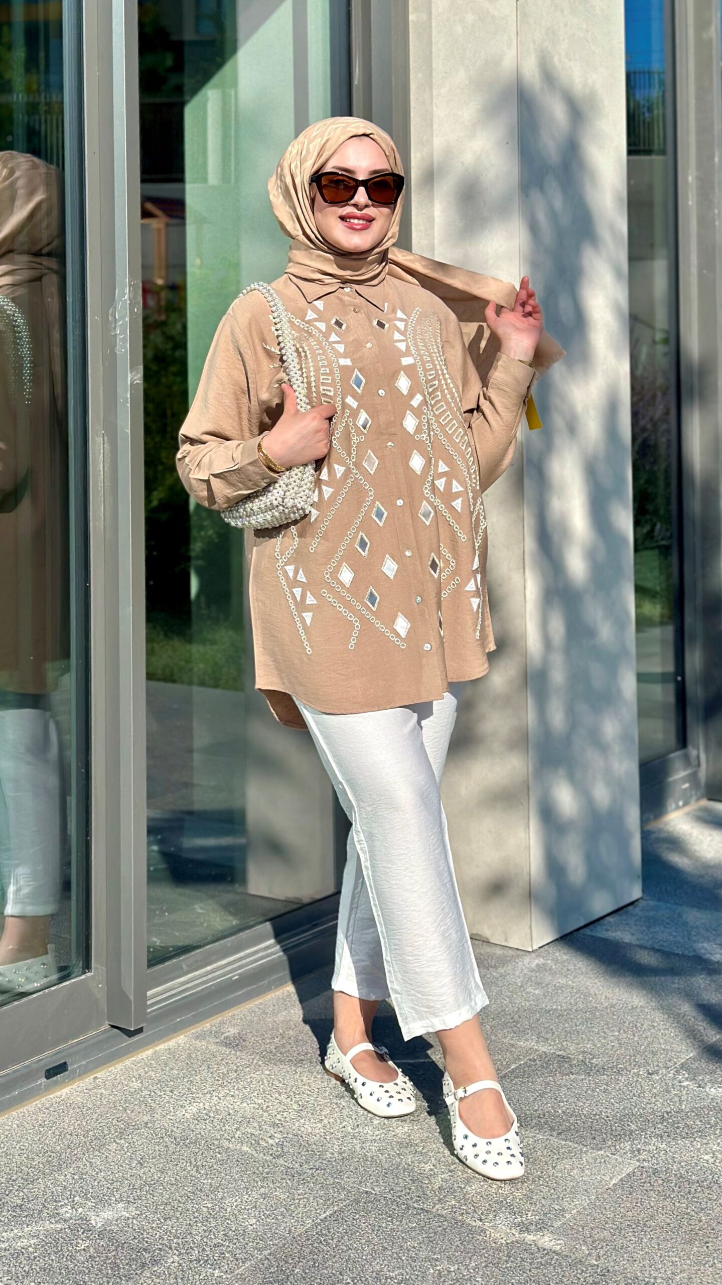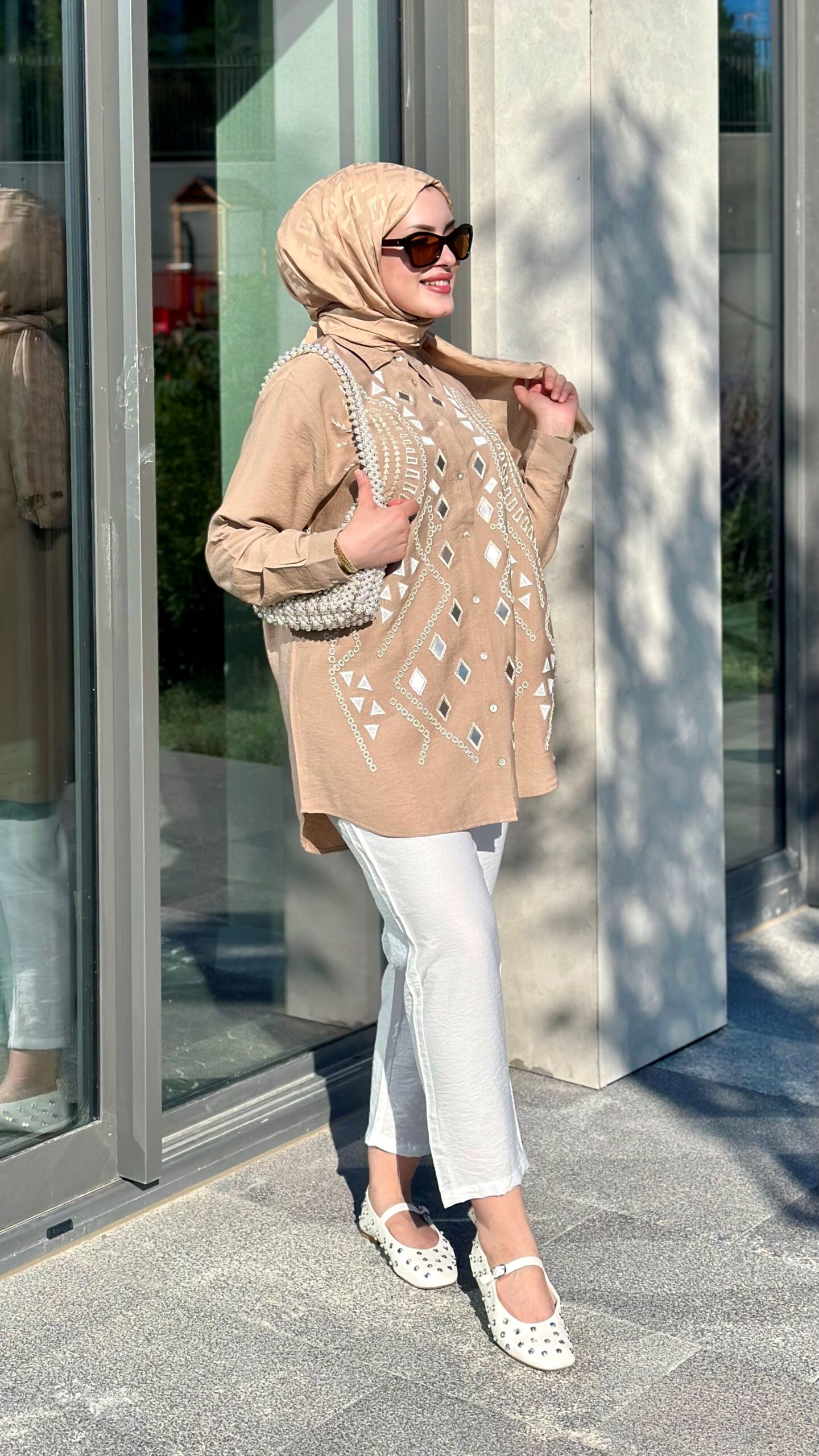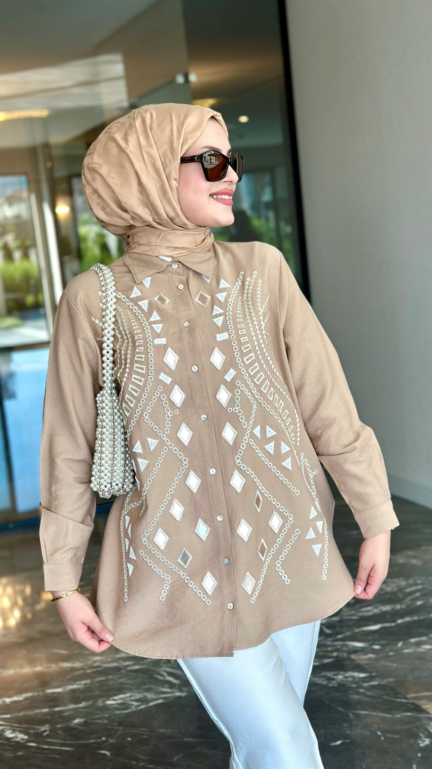 COLOR: BEIGE PRODUCT LENGTH: FRONT LENGTH: 77 CM BACK LENGTH: 79 CM EMBROIDERED EMBROIDERED OVERSIZE MOLD AND WITHOUT POCKET SHIRT COLLAR IS BUTTON CLOSED, FABRIC: 85% VISCON,