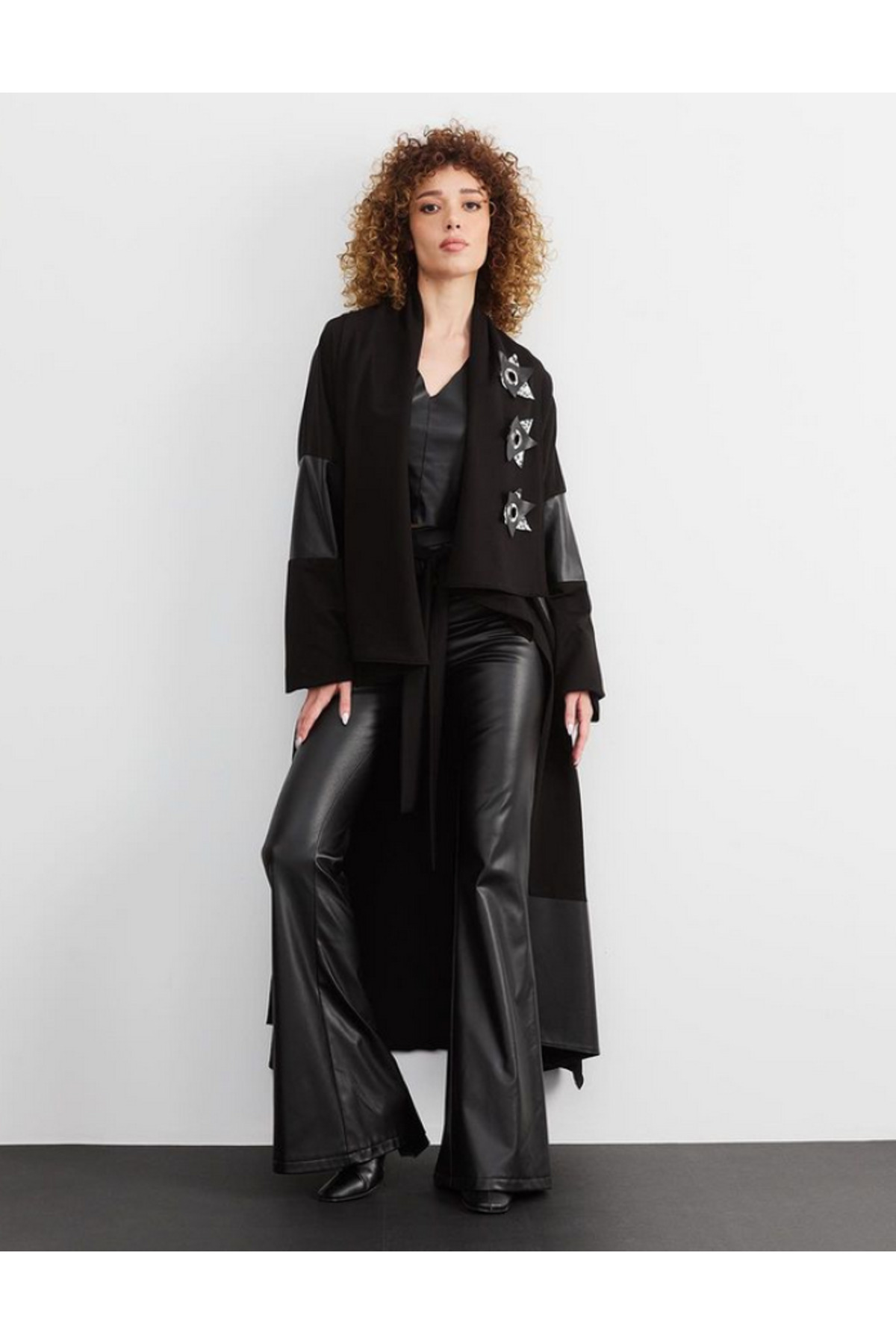 BELT CAPE WITH LEATHER DETAILED SIZE: STANDARD COLOR: BLACK THERE IS LEATHER DETAIL ON THE SLEEVES AND THE FRONT THERE IS AN ACCESSORY ON THE COLLAR IT IS A SHOW COLLAR IT IS BELT FABRIC: 90% COTTON-COTTON PRODUCT LENGTH: FRONT LENGTH: 129 CM, BACK LENGTH: 133 CM