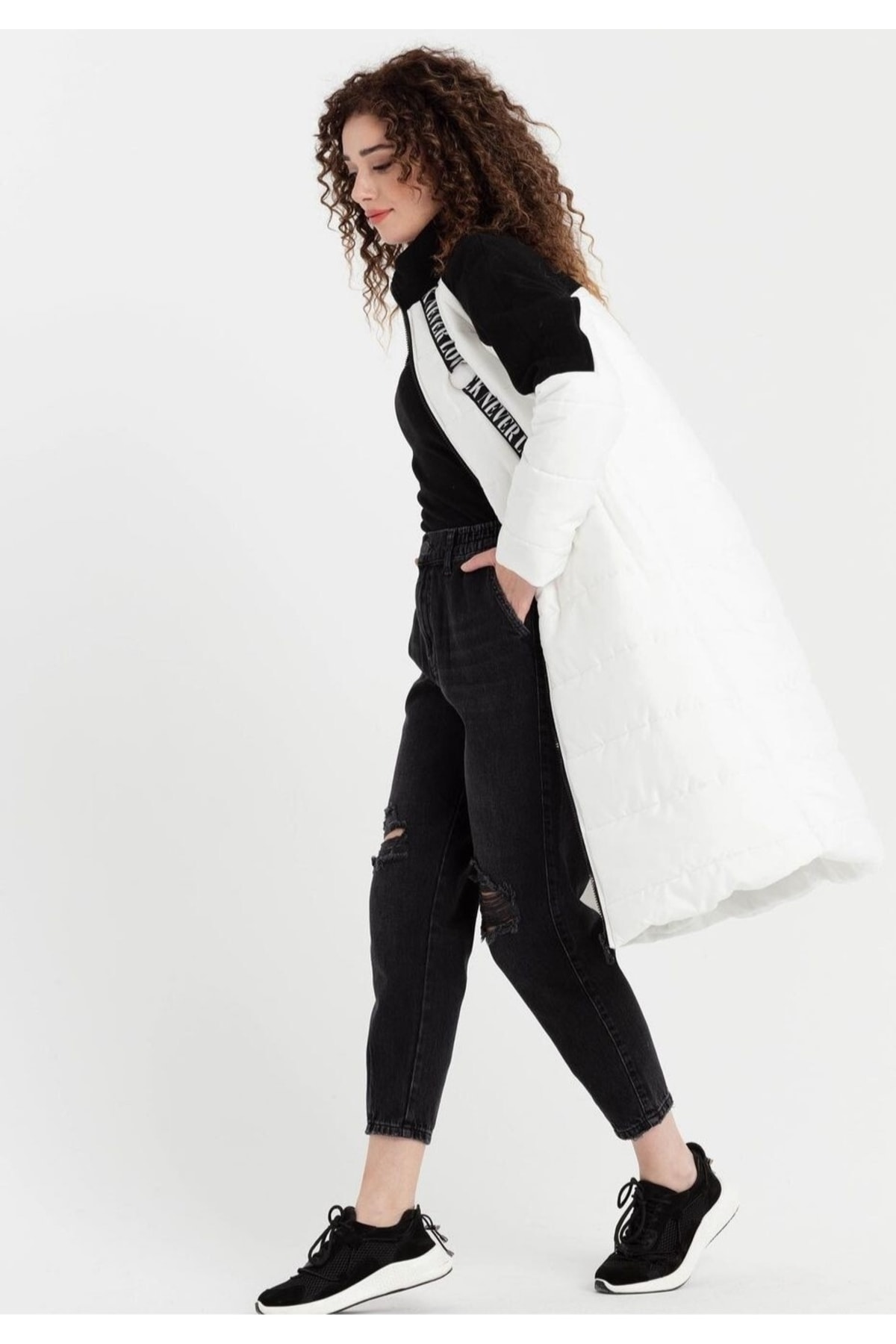 POWER COAT FABRIC: 30% cotton, 30% viscose, 40% polyester Product length: 102 cm LIGHT FIBER CONTENT, FULL STYLE WITH FLEECE BAND ON THE SHOULDERS, HAS POCKETS AND LINING COLOR: BLACK-WHITE IT HAS A ZIPPER