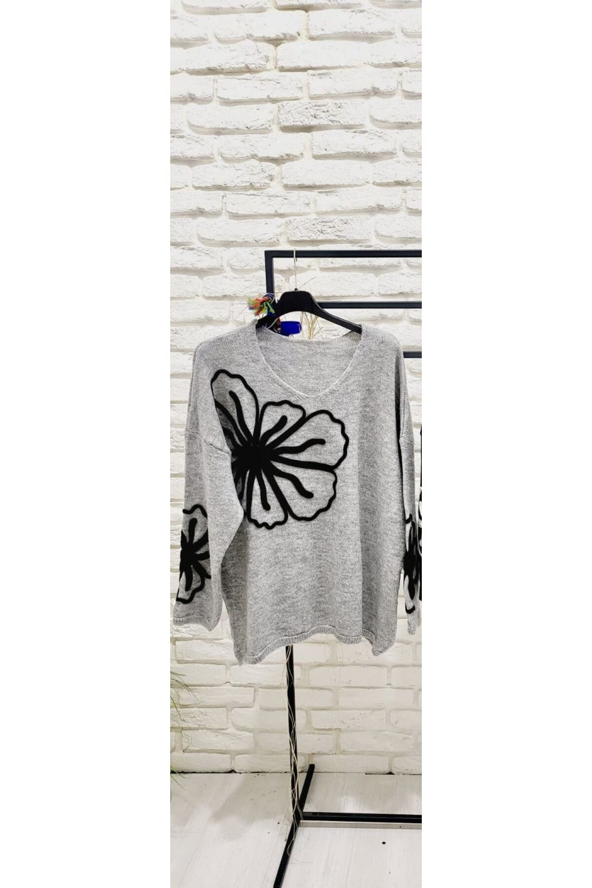 FLOWER MOTIF SWEATER COLOR: GRAY AND WHITE SIZE: STD SLEEVES AND FLORAL MOTIFS ON THE FRONT, WITHOUT POCKETS, PRODUCT LENGTH: FRONT LENGTH: 60 CM, BACK LENGTH: 63 CM, BATTEREN NECK