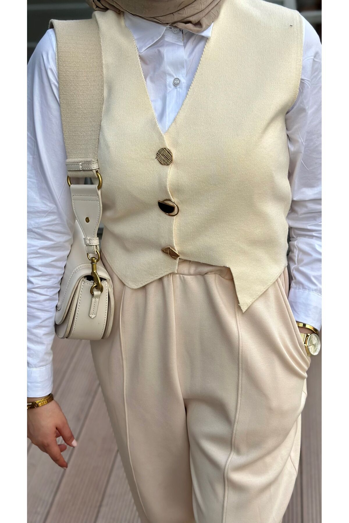 KNITWEAR VEST COLOR: THERE ARE CREAM AND BLACK COLORS. SIZE: STD PRODUCT LENGTH: 46 CM STYLISH BUTTONS, NO POCKETS, V-NECK!! THERE IS ASYMMETRIC CUT ON THE FRONT.