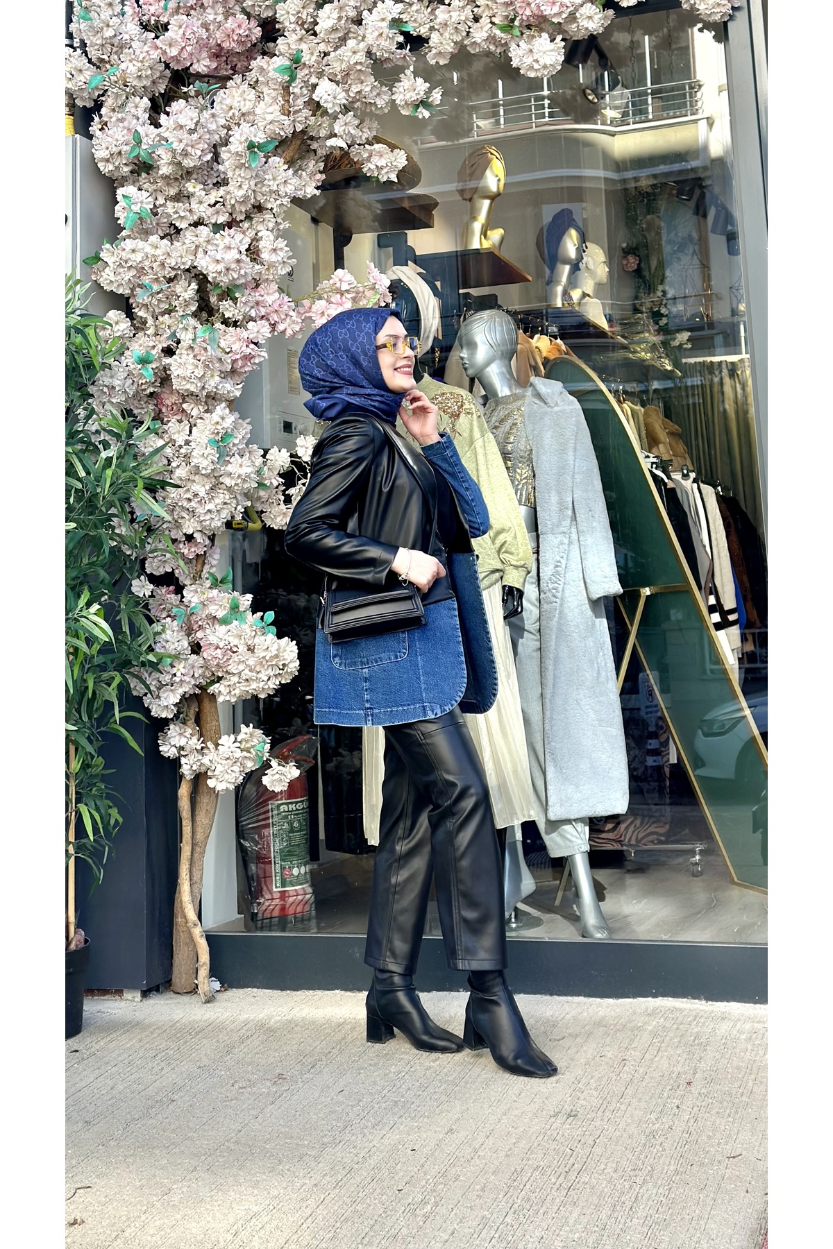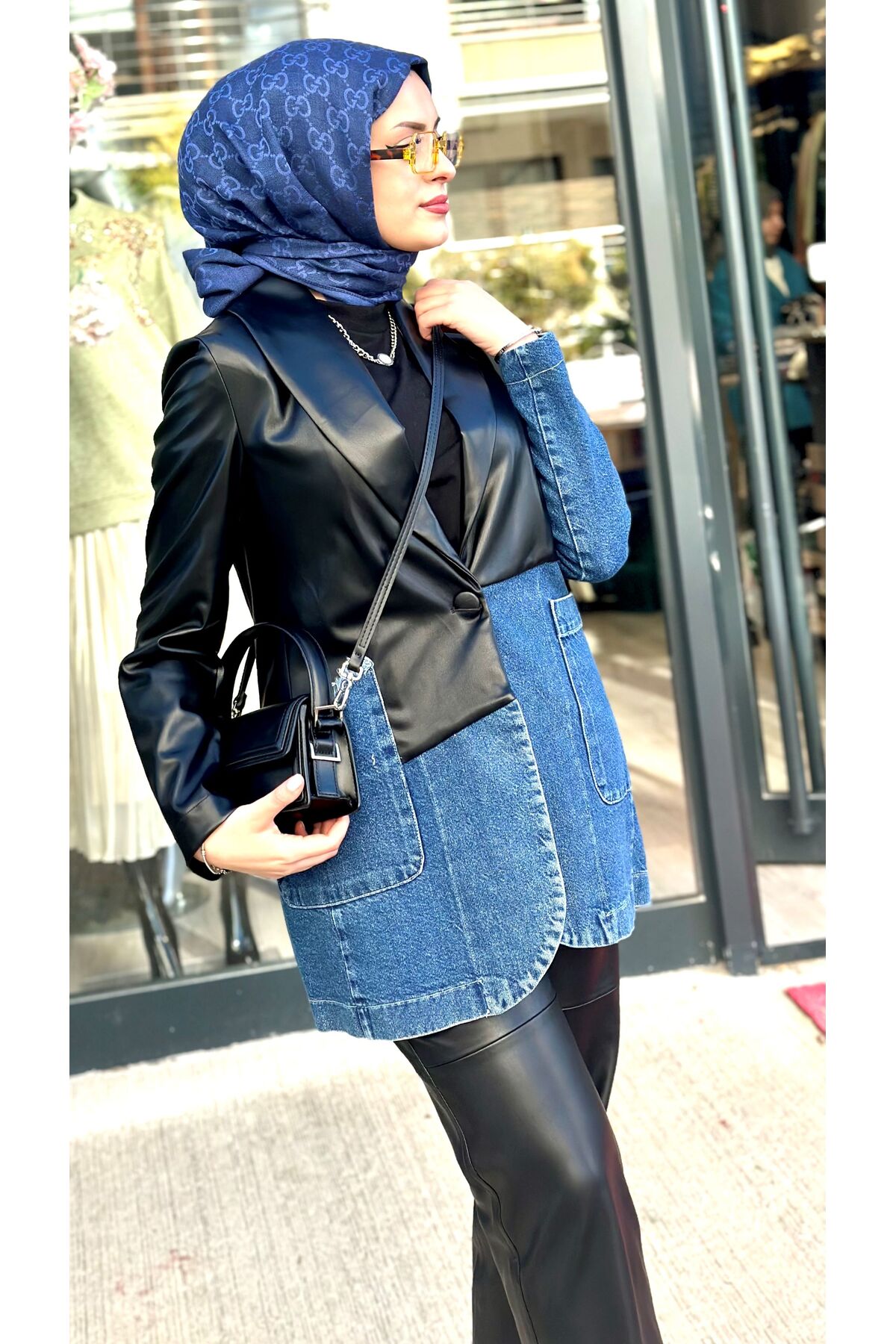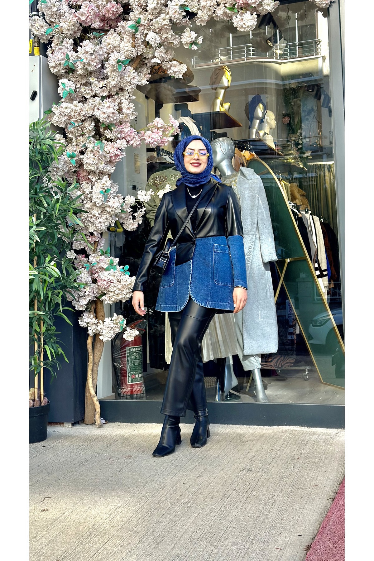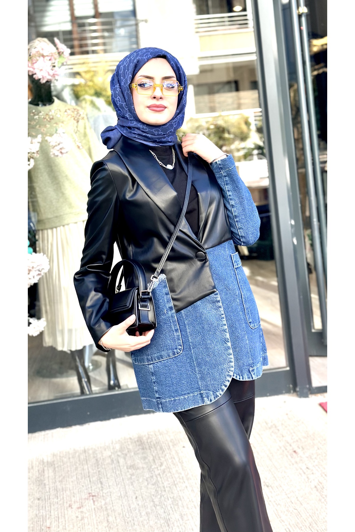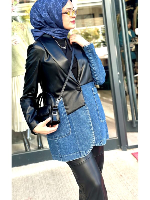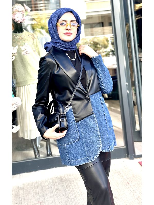 BLAZER JACKET COLOR: BLACK SIZE: S-M-L BLAZER CUT IT IS IN DENIM-ARTIFICIAL LEATHER MIX SHAPE. PRODUCT LENGTH: 77 CM THERE ARE 2 POCKETS ON THE FRONT