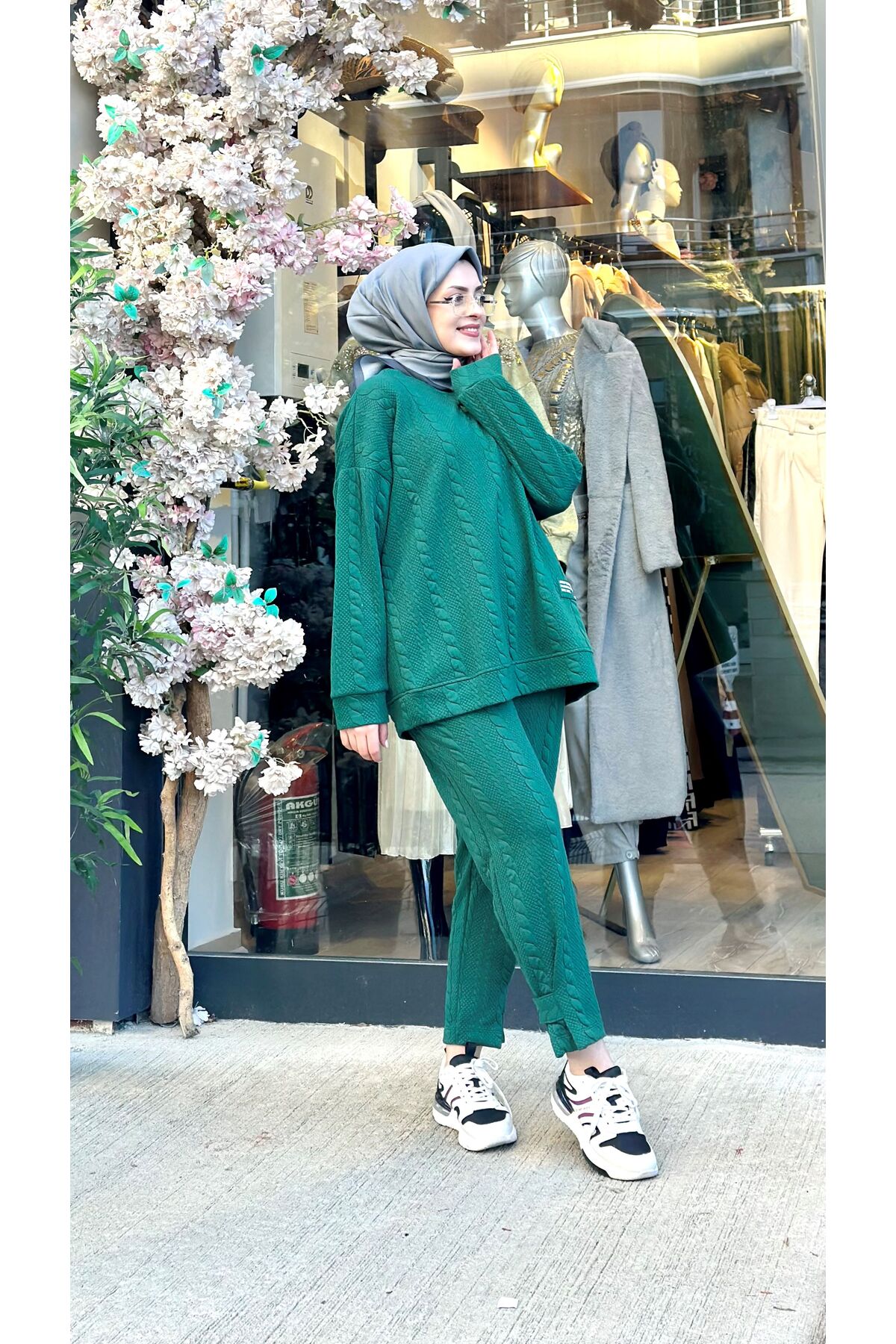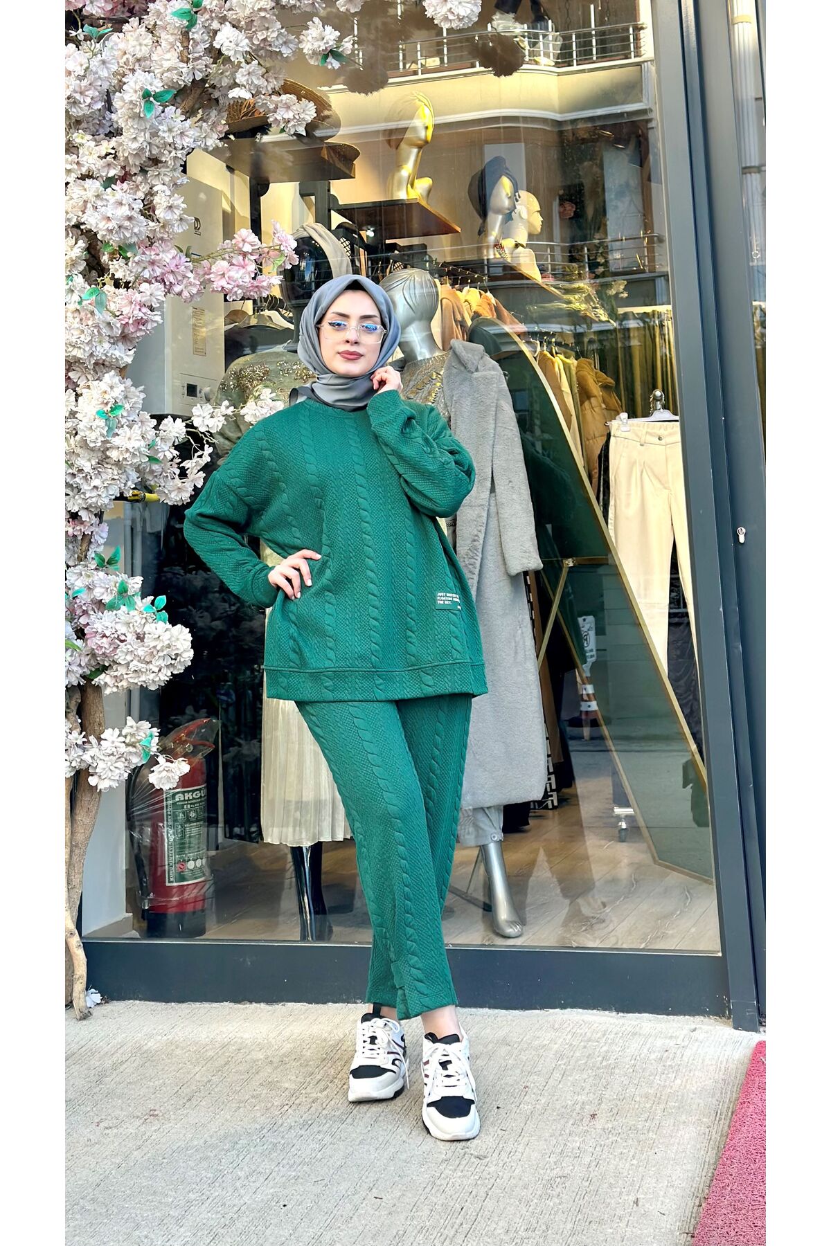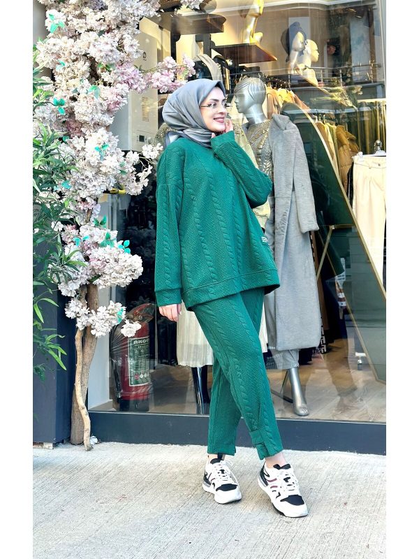 KNITTED PATTERNED LABELED SUIT COLOR: BEIGE AND EMERALD GREEN PRODUCT LENGTH: BLOUSE LENGTH: 73 CM, TROUSER LENGTH: 93 CM. IT HAS A ROUND COLLAR BLOUSE WITHOUT POCKETS, BUTTON DETAILS ON THE CANDLE.