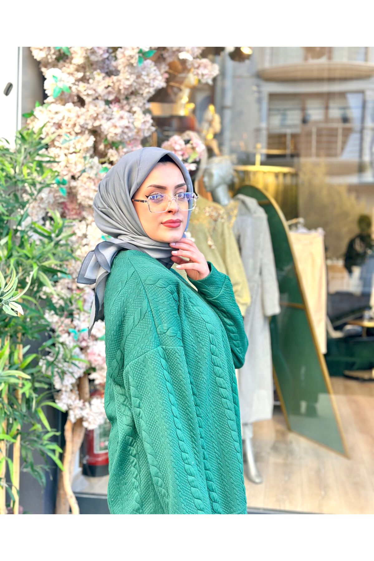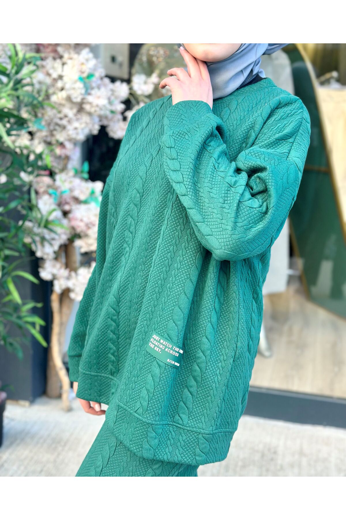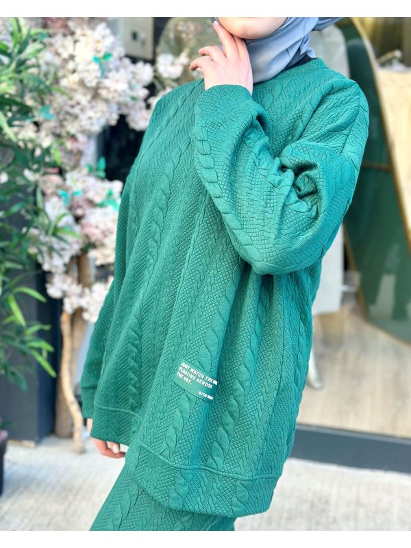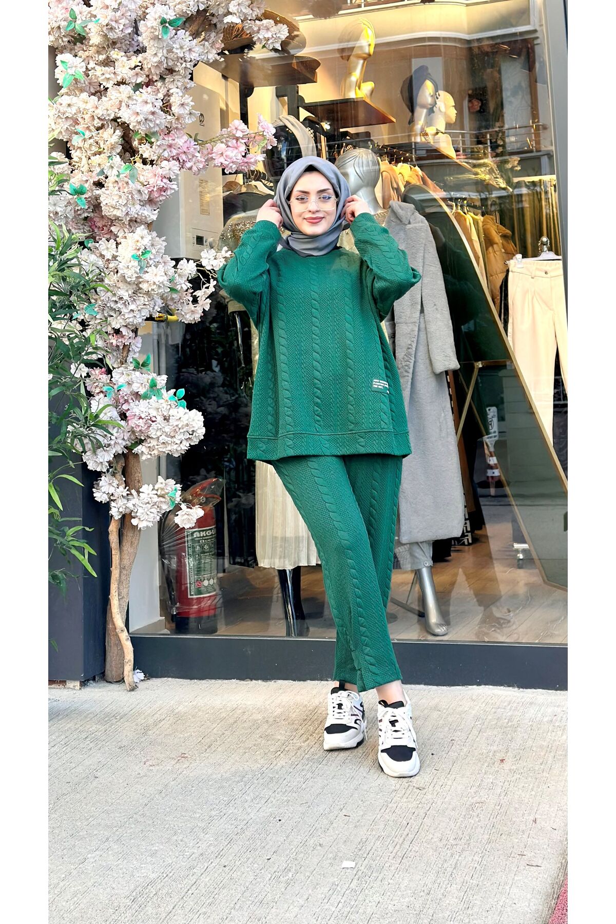 KNITTED PATTERNED LABELED SUIT COLOR: BEIGE AND EMERALD GREEN PRODUCT LENGTH: BLOUSE LENGTH: 73 CM, TROUSER LENGTH: 93 CM. IT HAS A ROUND COLLAR BLOUSE WITHOUT POCKETS, BUTTON DETAILS ON THE CANDLE.