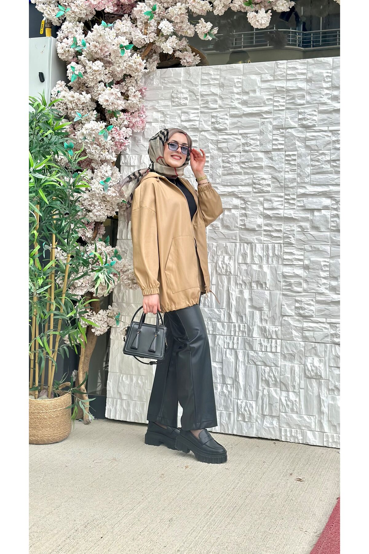 ZIPPERED LEATHER BOMBER JACKET COLOR: BLACK-EARTH SIZE: STD PRODUCT LENGTH: 74 CM THE PRODUCT IS HOODED AND HAS KANGAROO POCKET