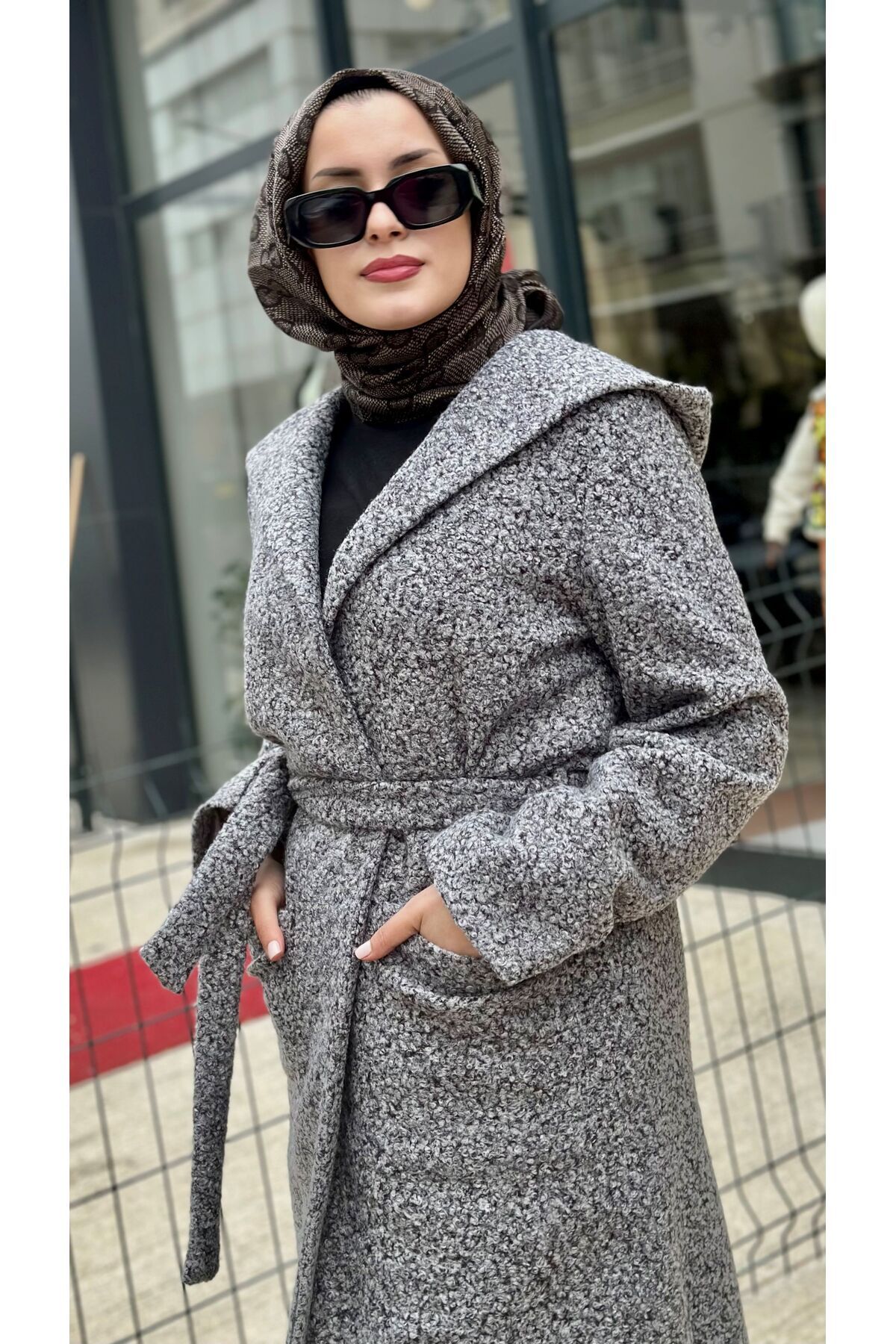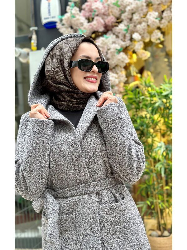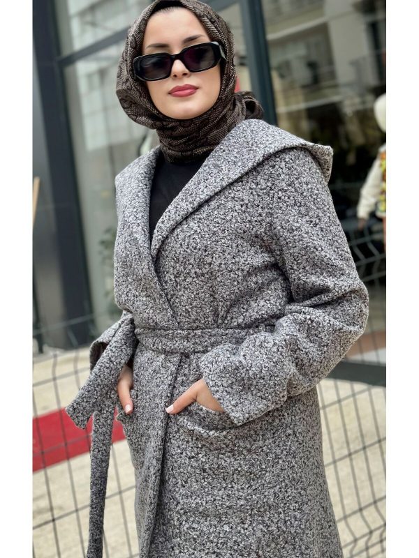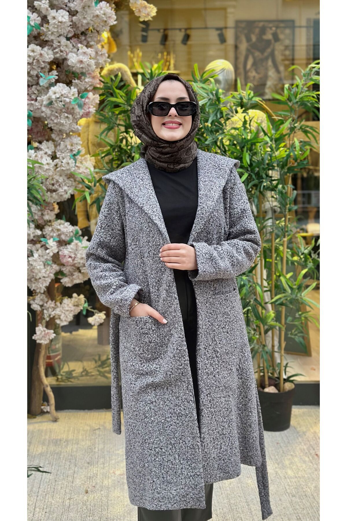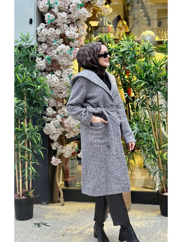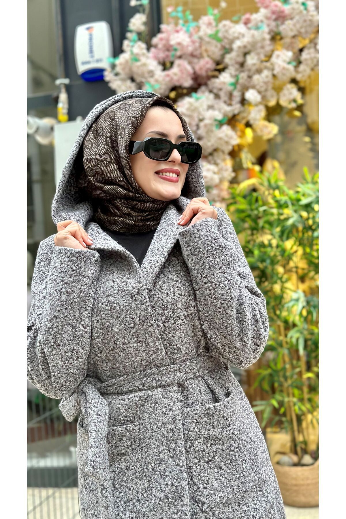 BUCLET COAT COLOR: GRAY SIZE: 36-38-40 IT IS HOODED AND LINED IT HAS A TIE BELTED, THERE ARE 2 FRONT POCKETS PRODUCT LENGTH: 105 CM FABRIC: 30% WOOL,