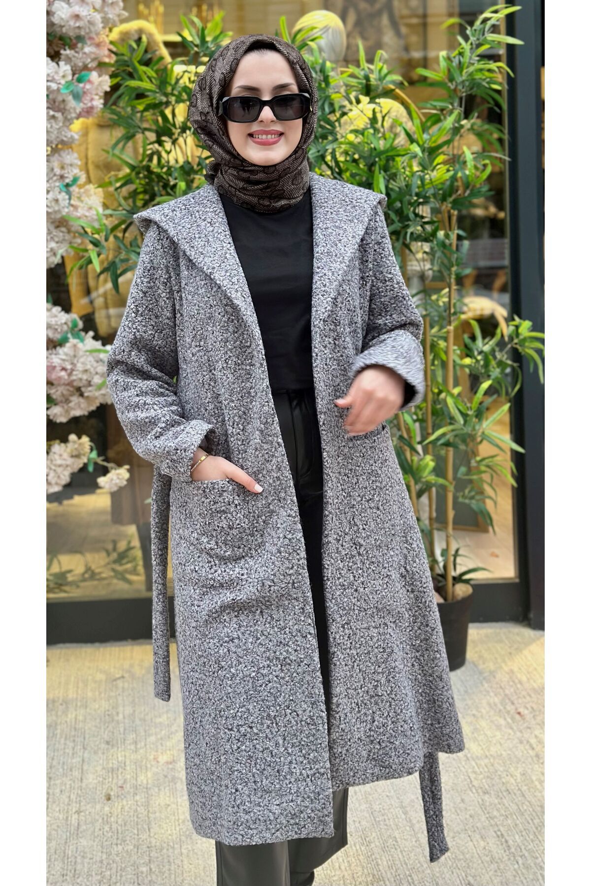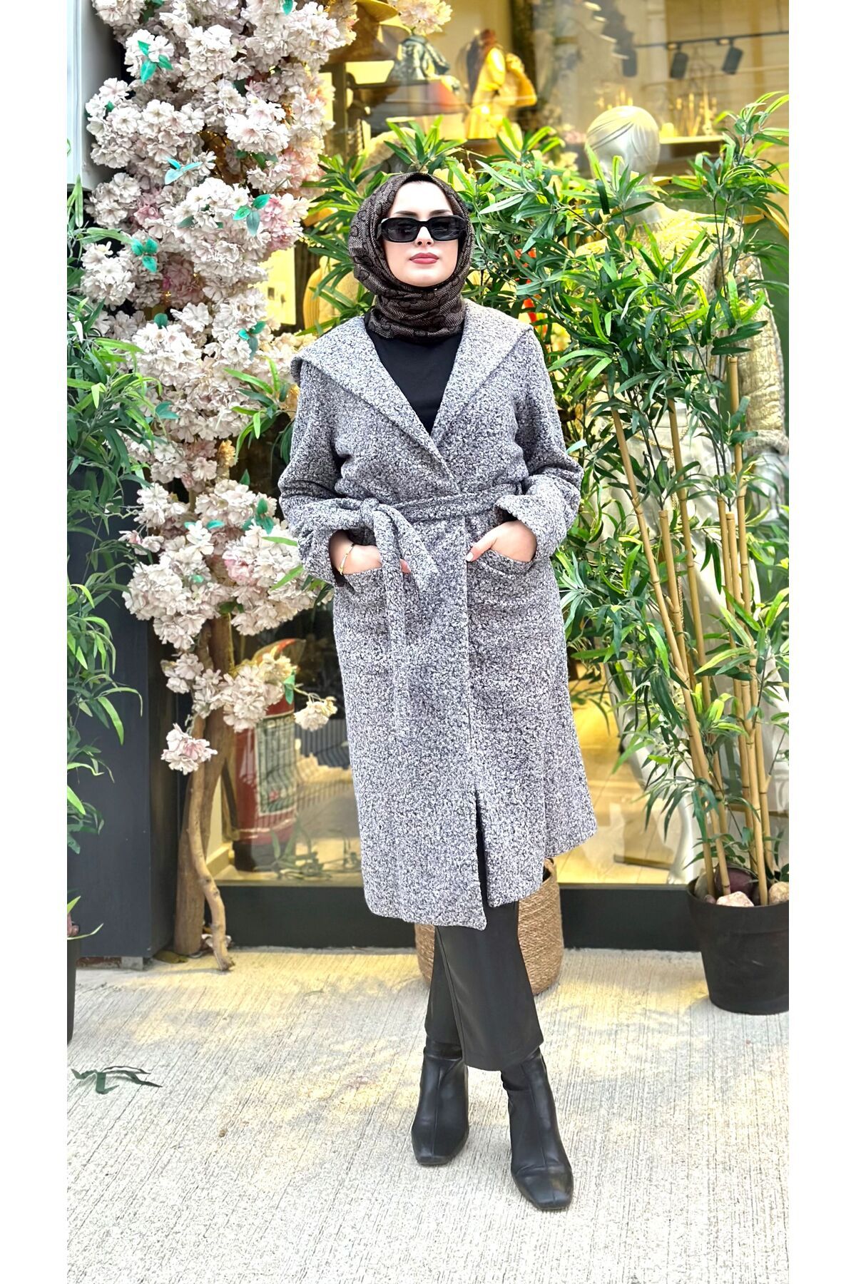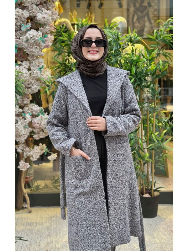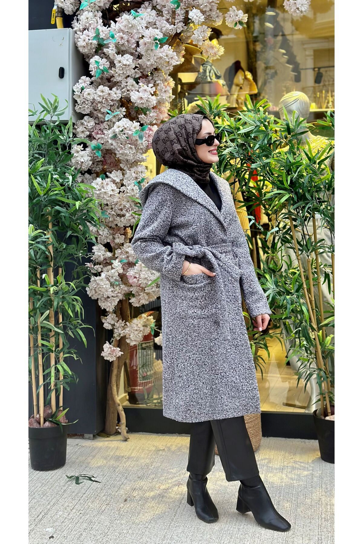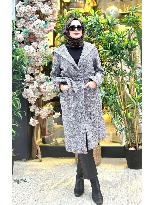 BUCLET COAT COLOR: GRAY SIZE: 36-38-40 IT IS HOODED AND LINED IT HAS A TIE BELTED, THERE ARE 2 FRONT POCKETS PRODUCT LENGTH: 105 CM FABRIC: 30% WOOL,