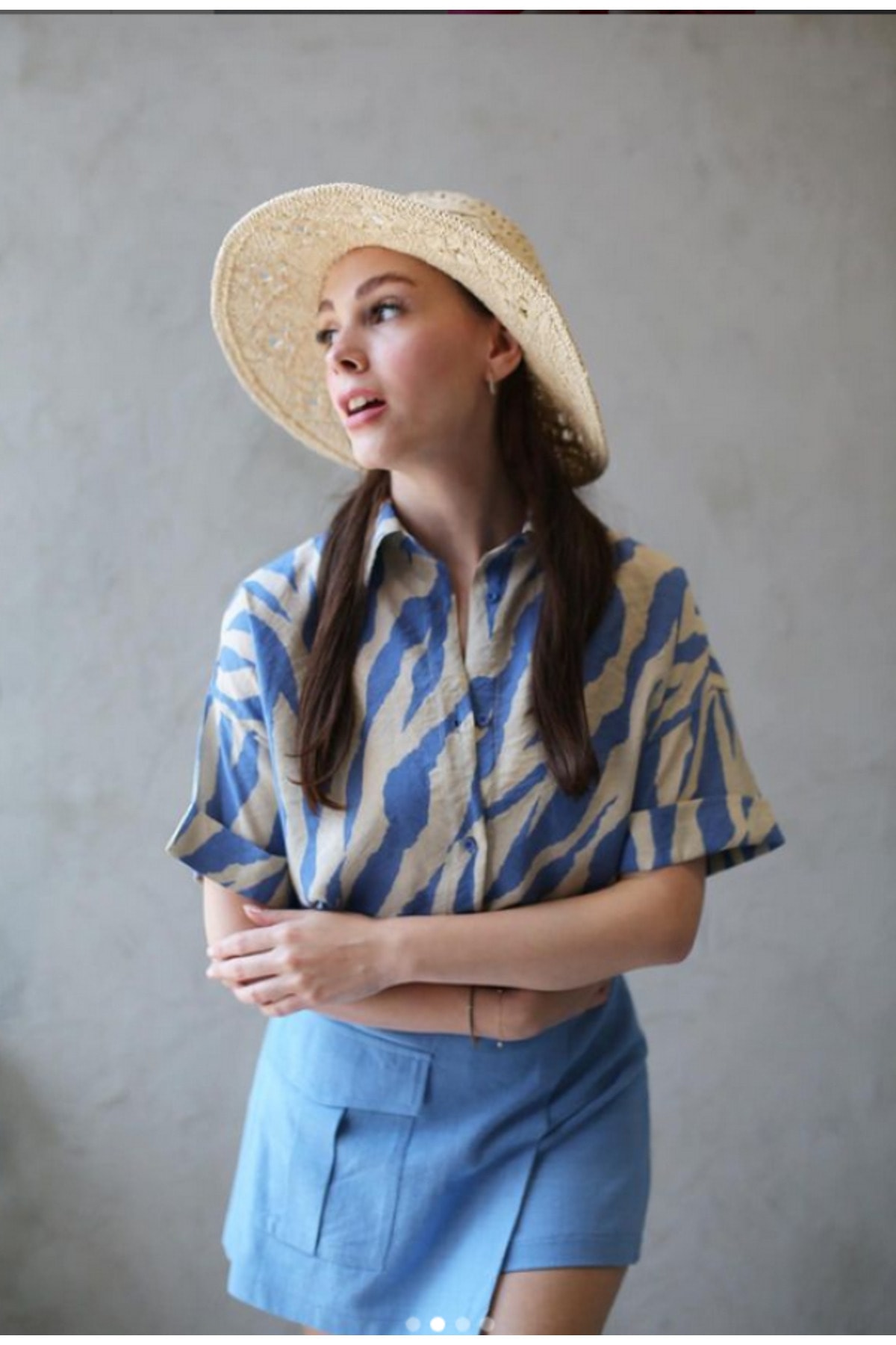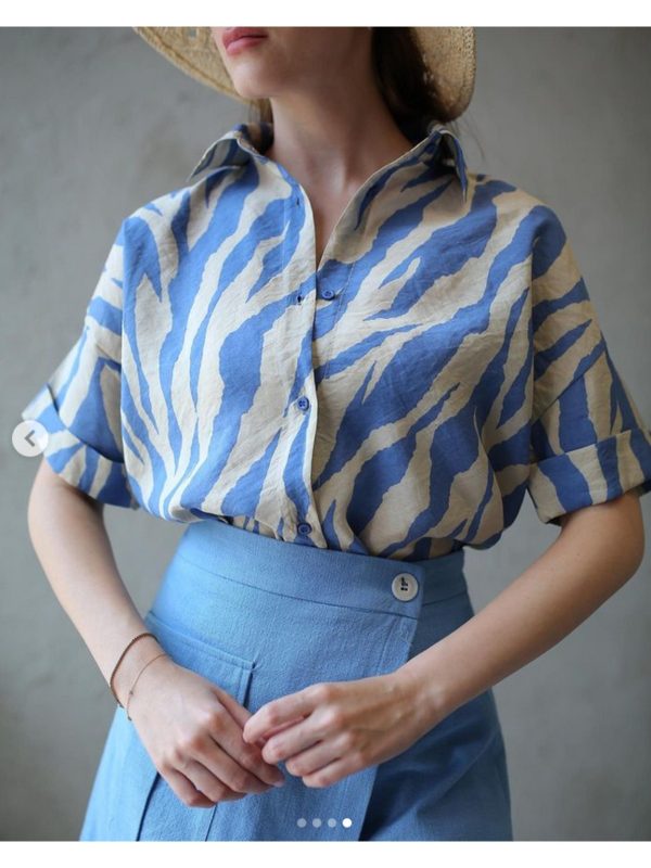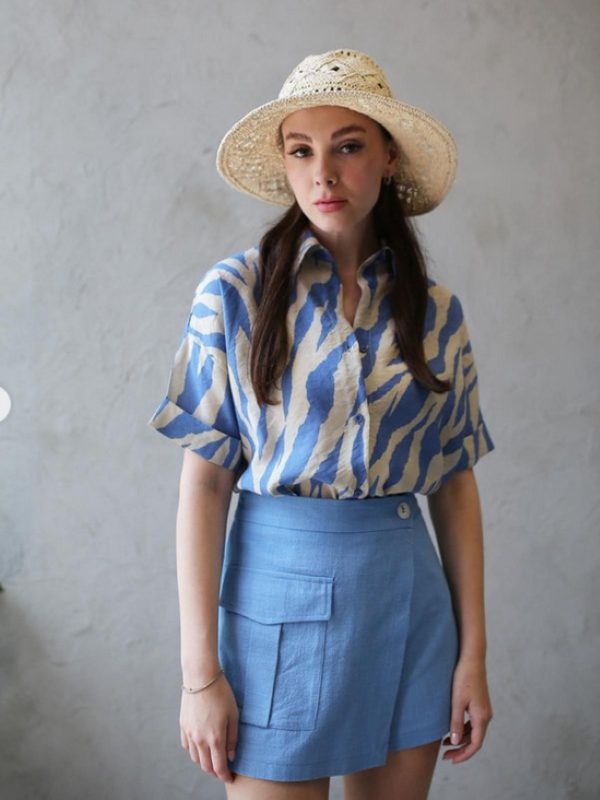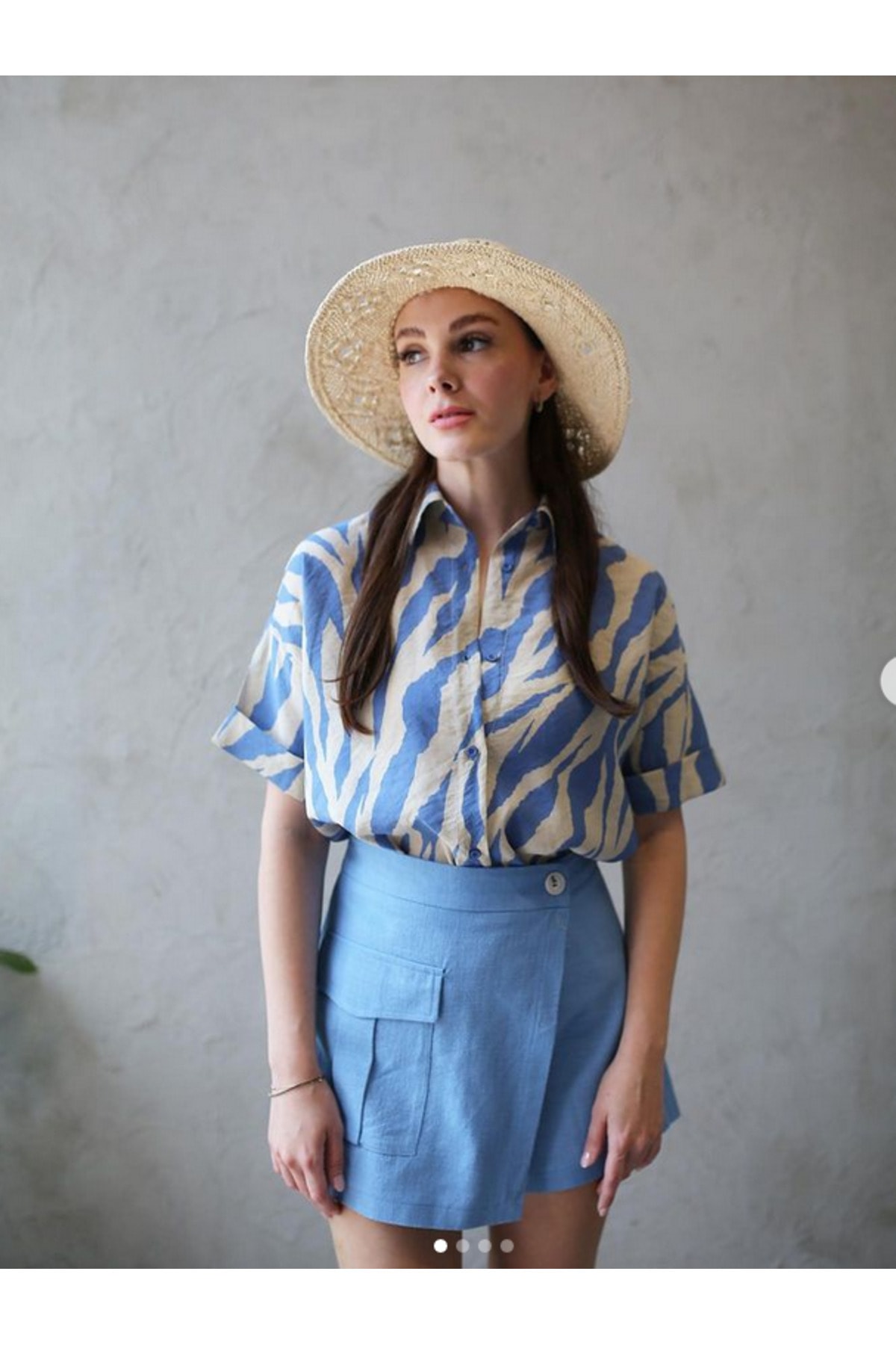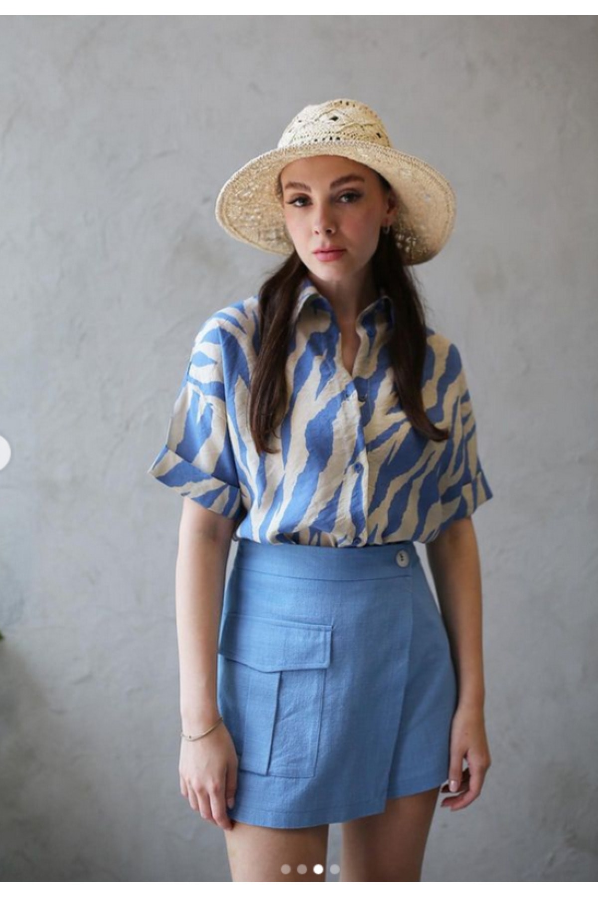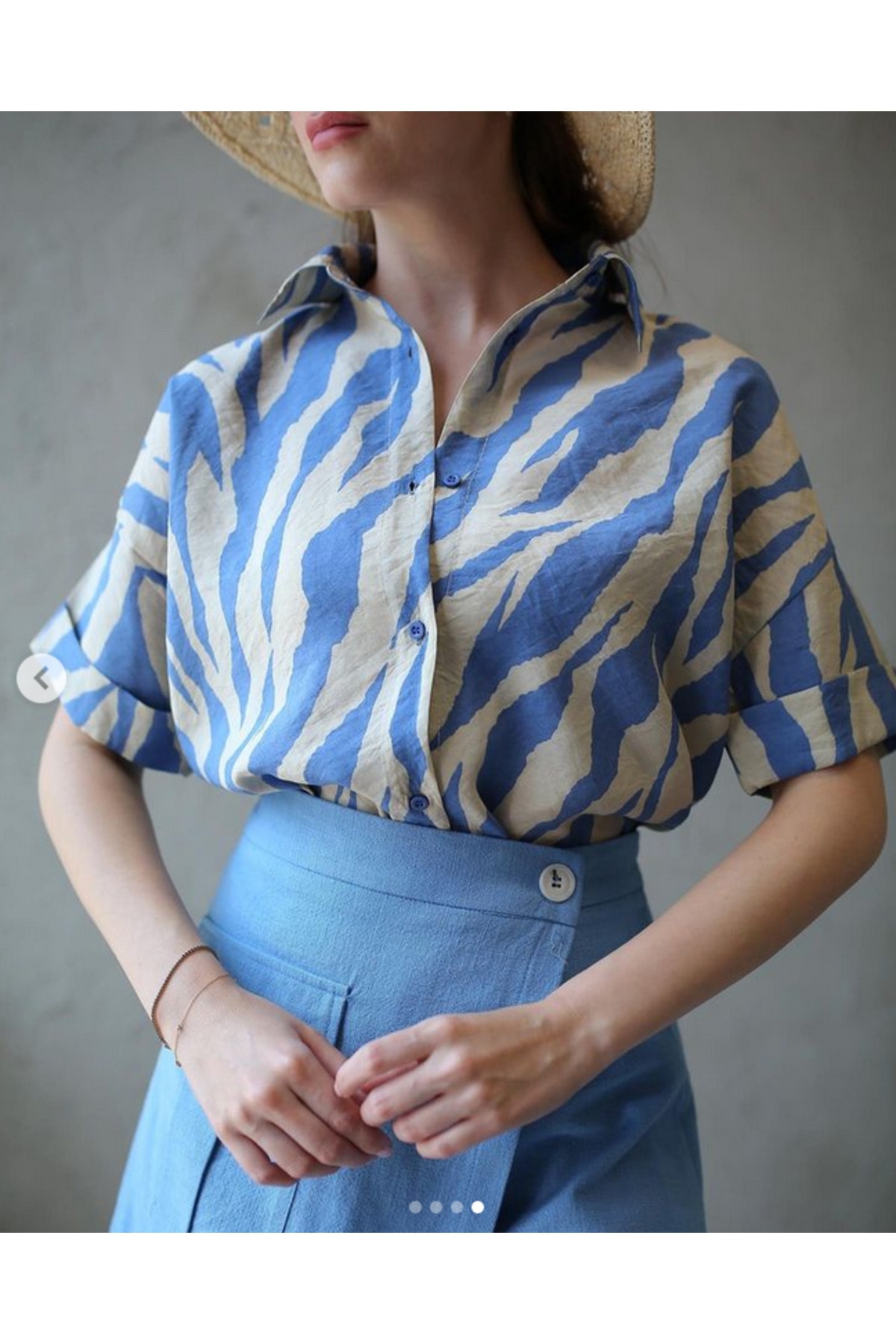 PATTERNED SHIRT IS IN SIZE COLOR: BLUE PRODUCT LENGTH: FRONT 62 CM; BACK LENGTH: 70 CM WITH SHORT SLEEVE, NO POCKET, AND SHIRT COLLAR
