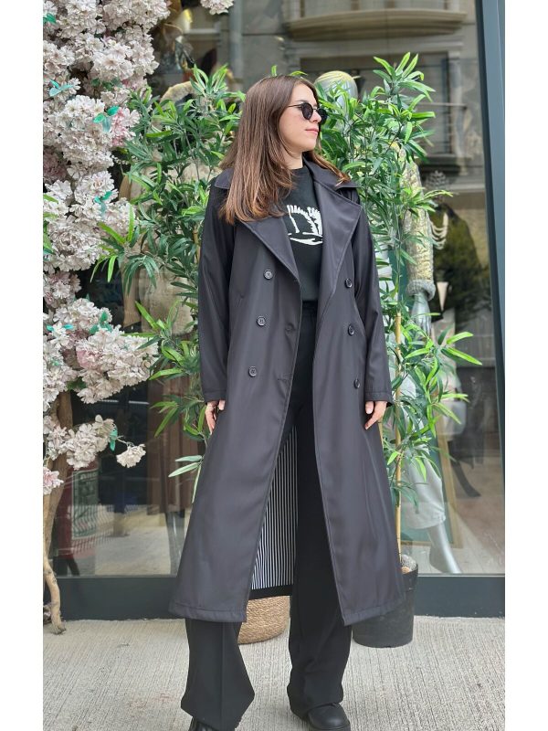 IT IS TRENCH COAT SIZE COLOR: BLACK PRODUCT LENGTH: 114 CM. IT HAS A BELT, IT IS LINING, IT HAS HIDDEN POCKETS