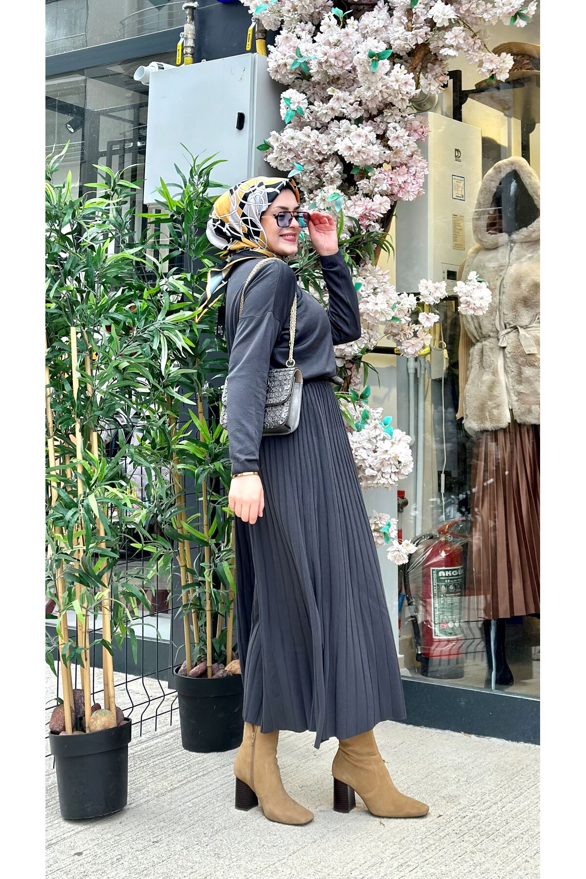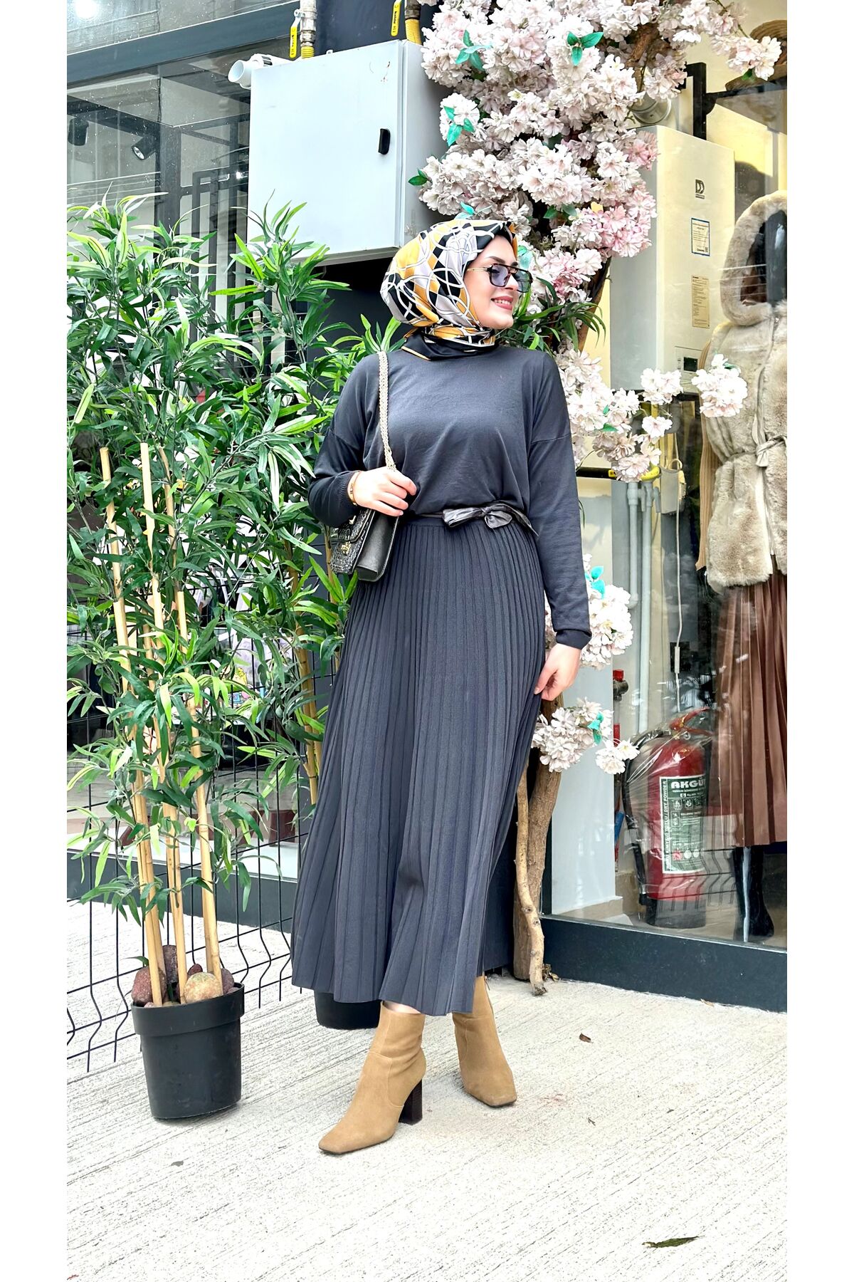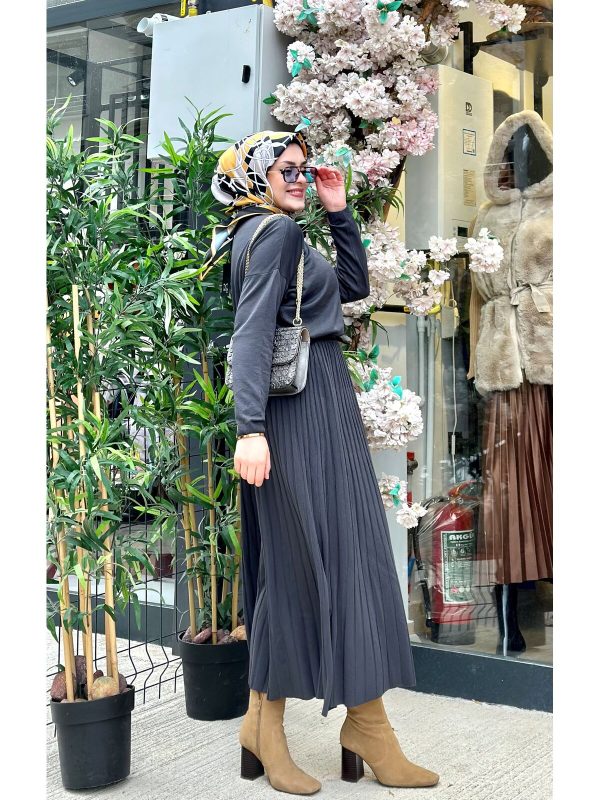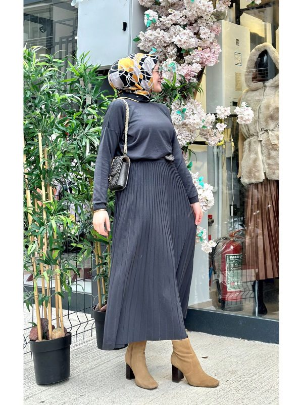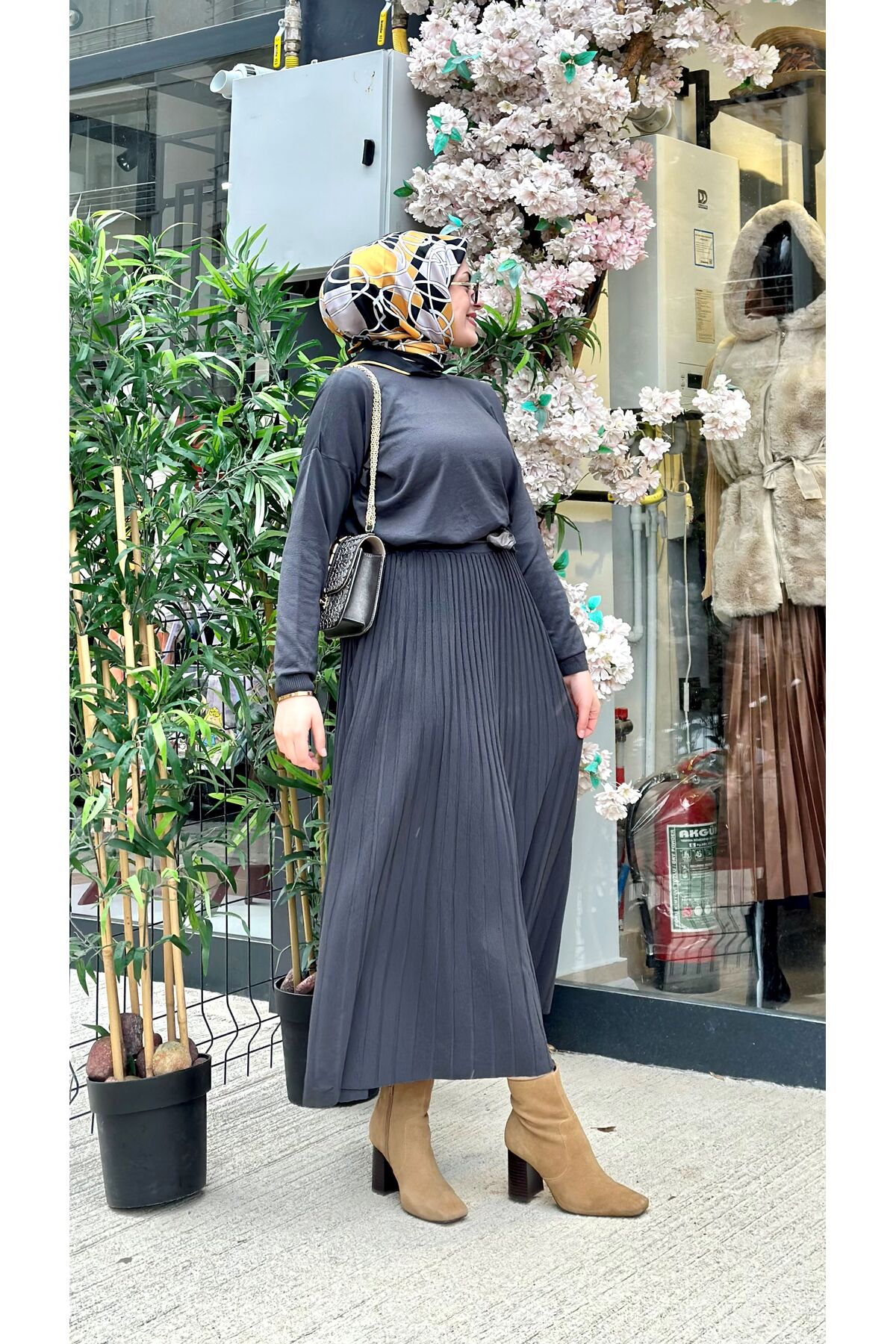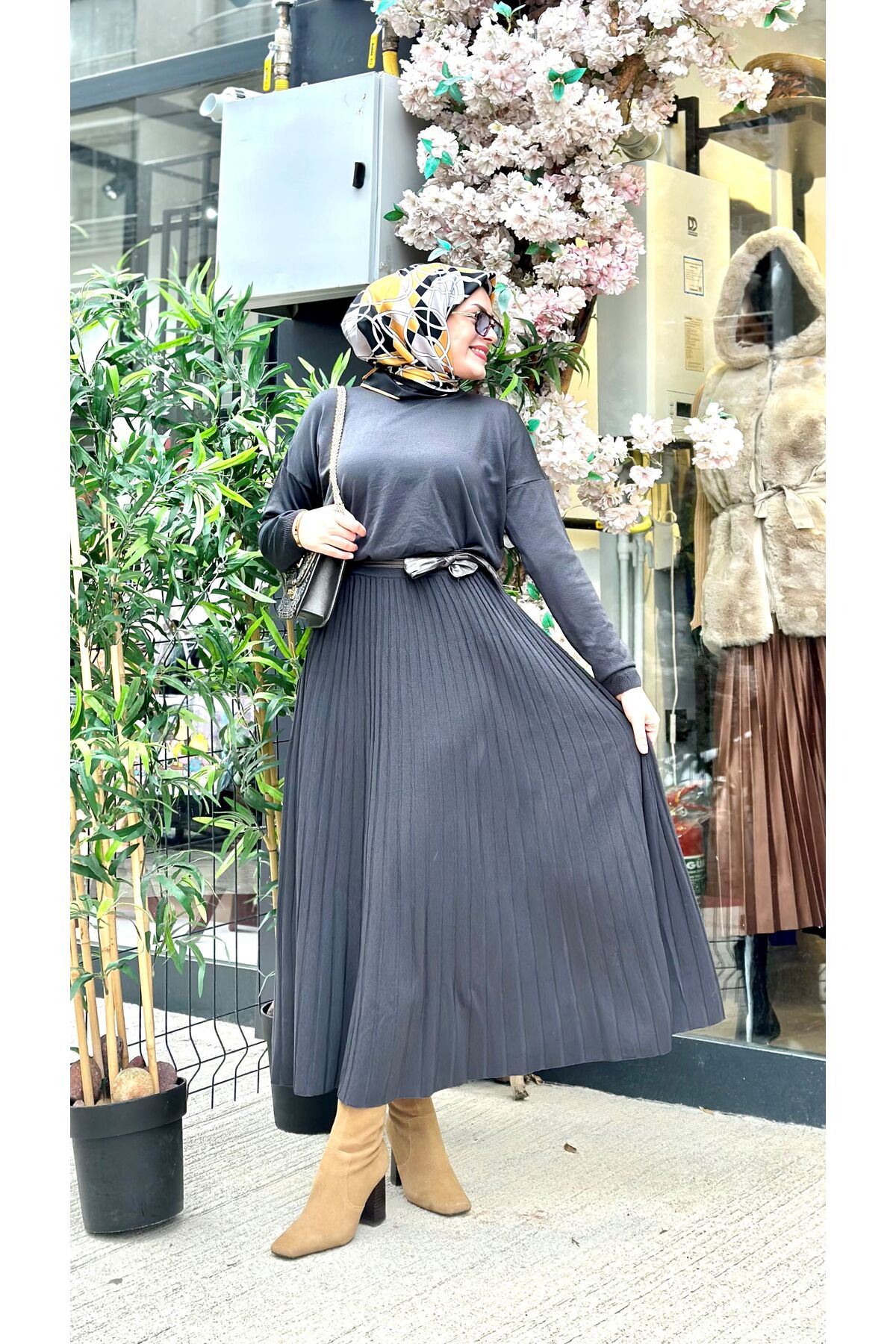 KNITWOOD SKIRT SUIT COLOR: ANTHRACITE SIZE: 1 AND 2, PRODUCT LENGTH: BLOUSE: 74 CM, SKIRT: 91 CM. THE SKIRT IS A PLEATED MODEL BLOUSE HAS POCKETS. IT IS ROUND COLLAR. FABRIC: 65% RAYON.