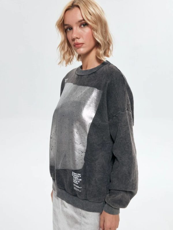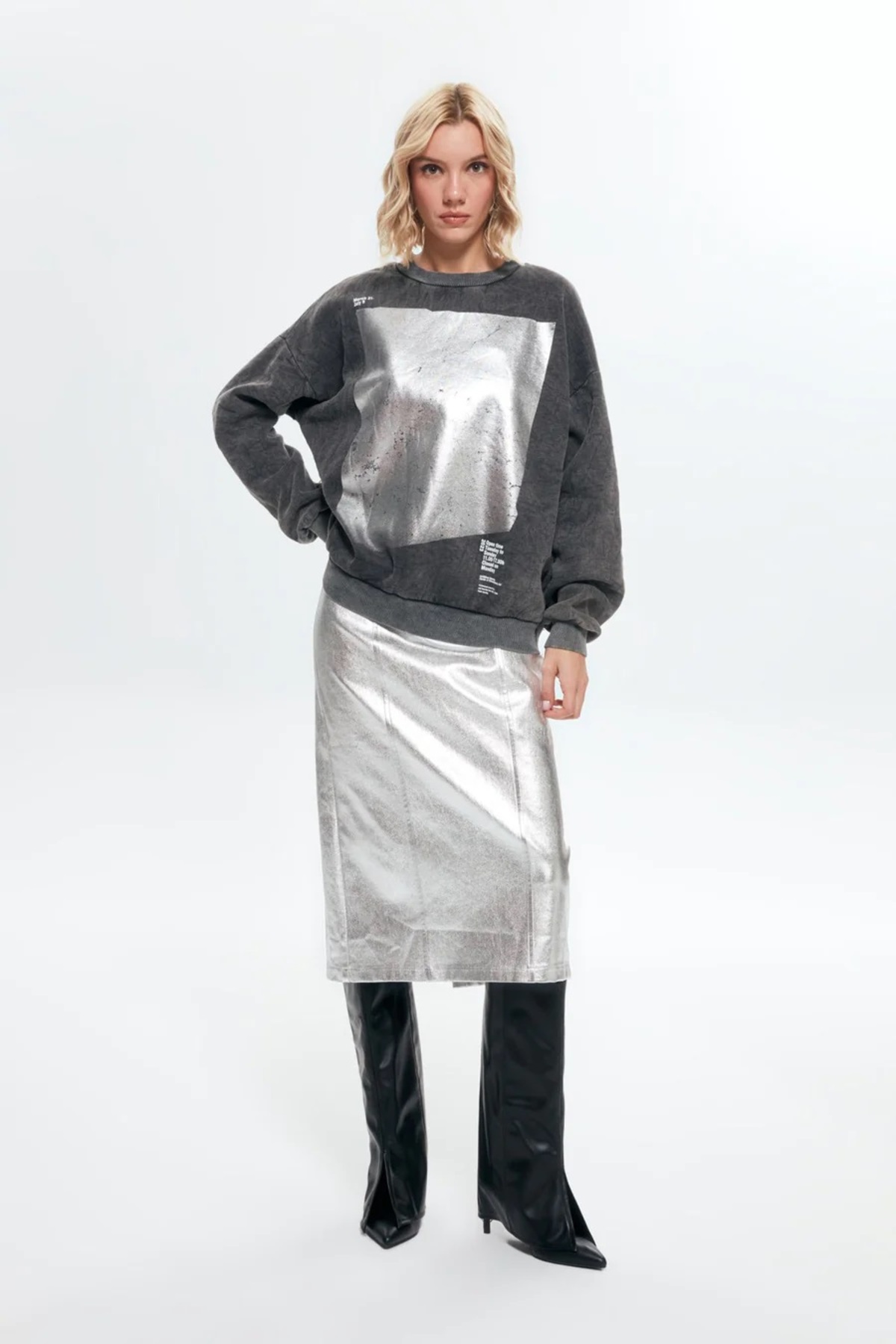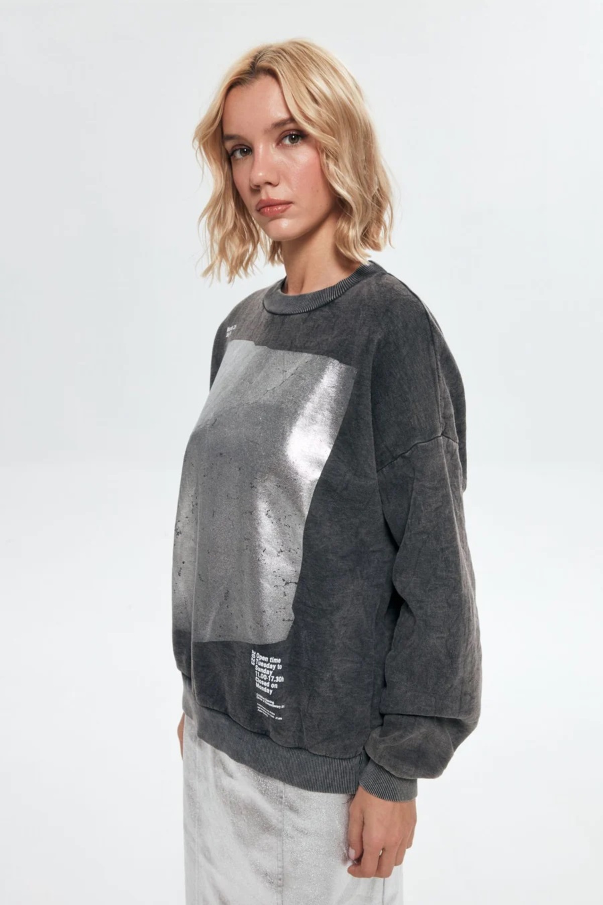 FOIL PRINTED SWEATSHIRT COLOR: ANTHRACITE SIZE S-M-L PRODUCT LENGTH: 67 CM FABRIC: 65% COTTON, Product/Mannequin Measurements: Height: 67 cm Chest: 68 cm