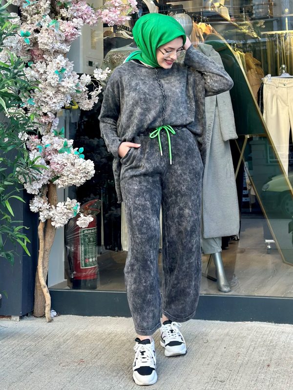 TOP-BOTTOM SET COLOR: THERE ARE GRAY AND GREEN COLORS, SIZE: STANDARD PRODUCT LENGTH: TUNIC FRONT LENGTH: 56 CM BACK LENGTH: 65 CM TROUSERS LENGTH: 92 CM OWERSIZE CUT TROUSERS HAVE ELASTY WAIST WAIST, HAS LOW SLEEVES AND POCKETS!!!IT IS A SLIM SUIT FABRIC. :100% COTTON