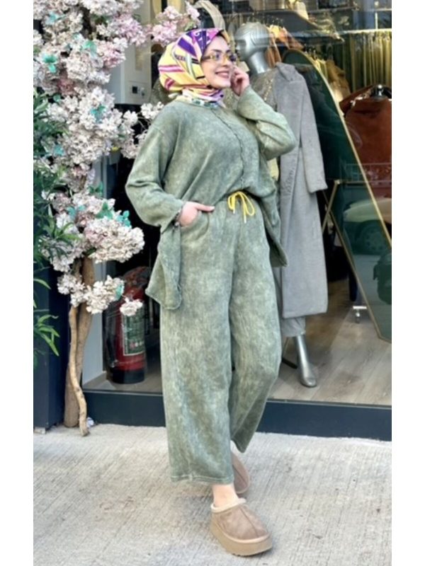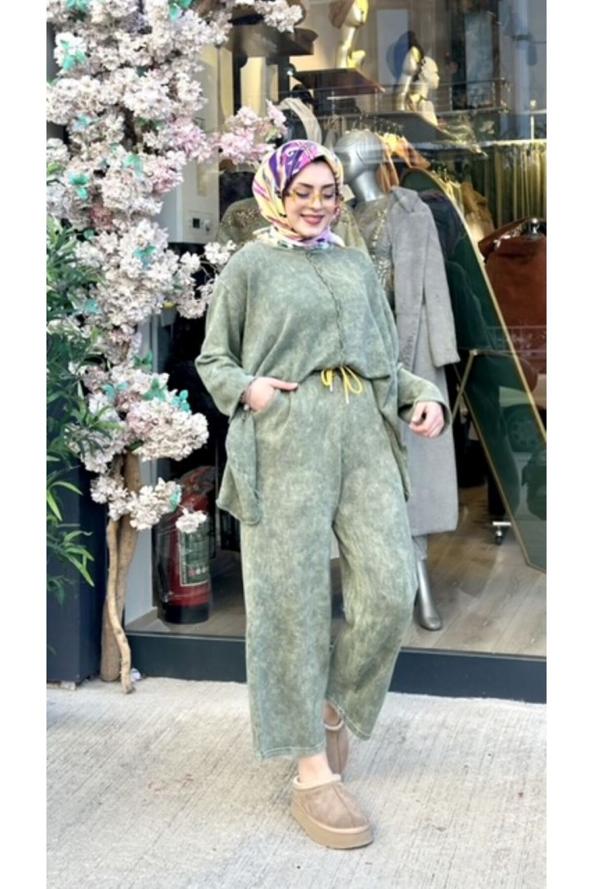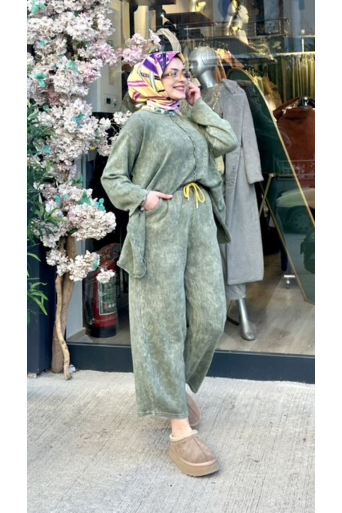 TOP-BOTTOM SET COLOR: THERE ARE GRAY AND GREEN COLORS, SIZE: STANDARD PRODUCT LENGTH: TUNIC FRONT LENGTH: 56 CM BACK LENGTH: 65 CM TROUSERS LENGTH: 92 CM OWERSIZE CUT TROUSERS HAVE ELASTY WAIST WAIST, HAS LOW SLEEVES AND POCKETS!!!IT IS A SLIM SUIT FABRIC. :100% COTTON