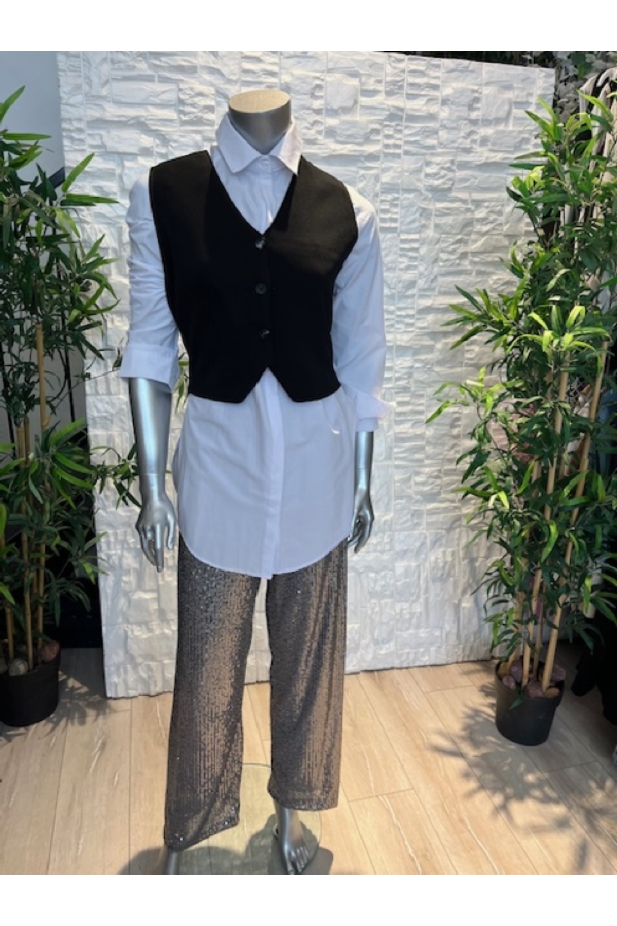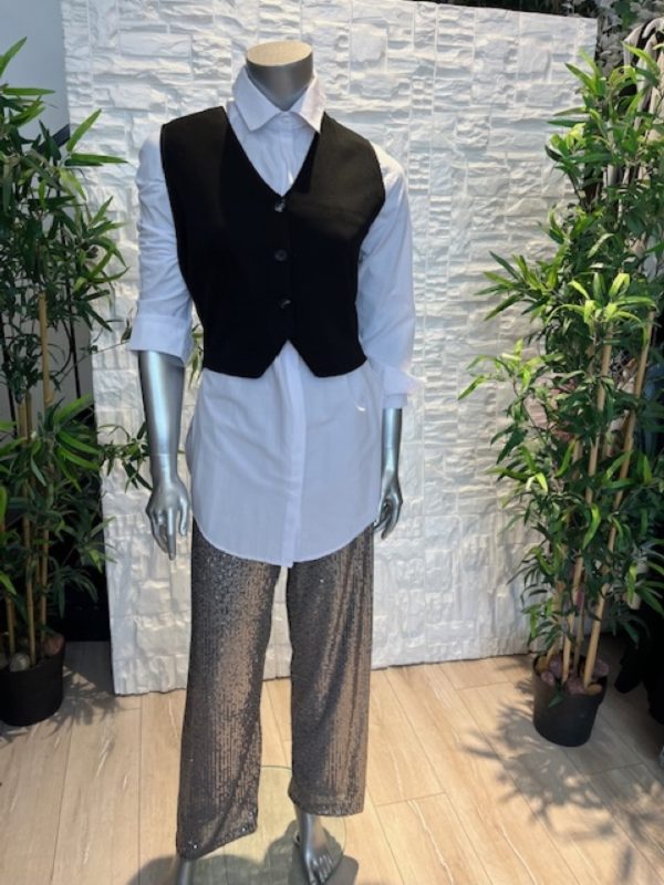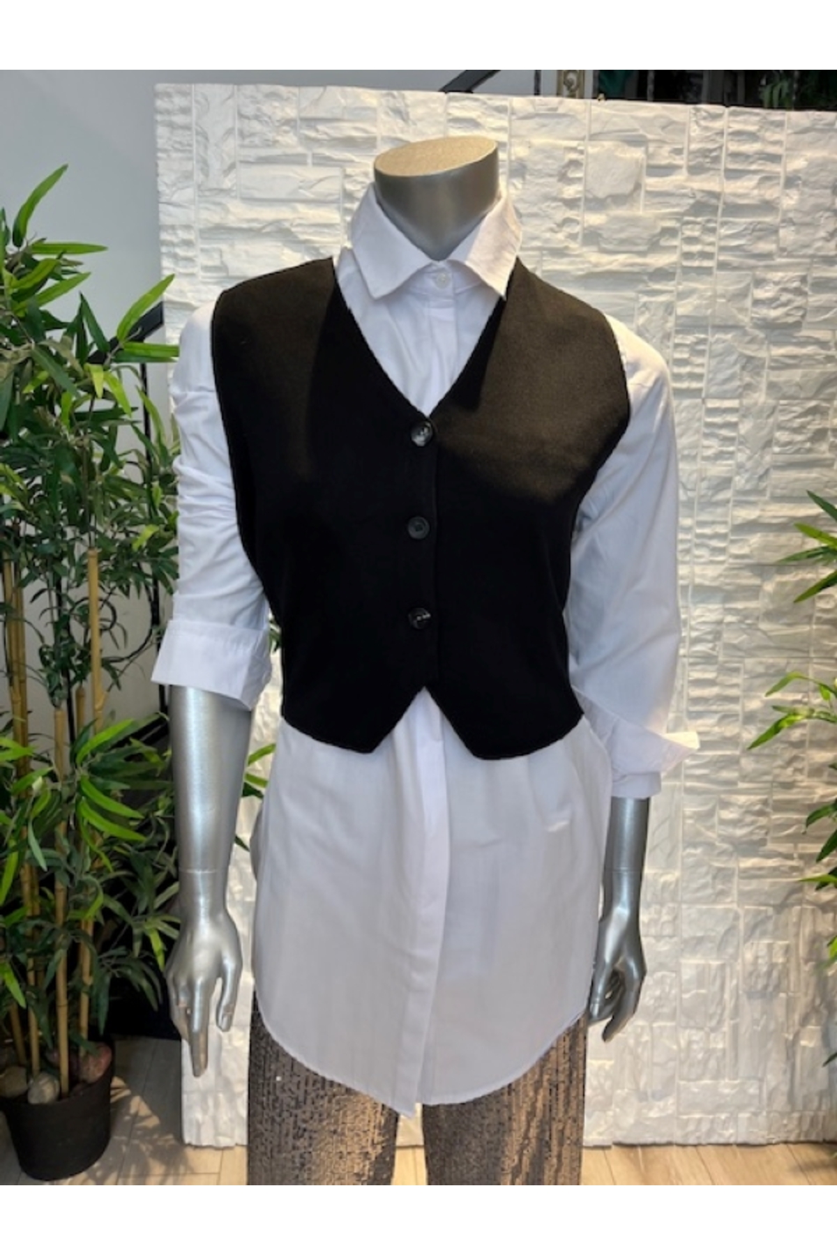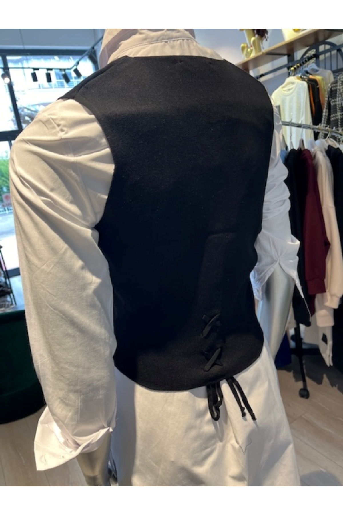 MERCERIZED VEST COLOR: BLACK SIZE 1 AND 2 PRODUCT LENGTH: 45 CM BUTTON CLOSURE AND BACK BINDING DETAIL