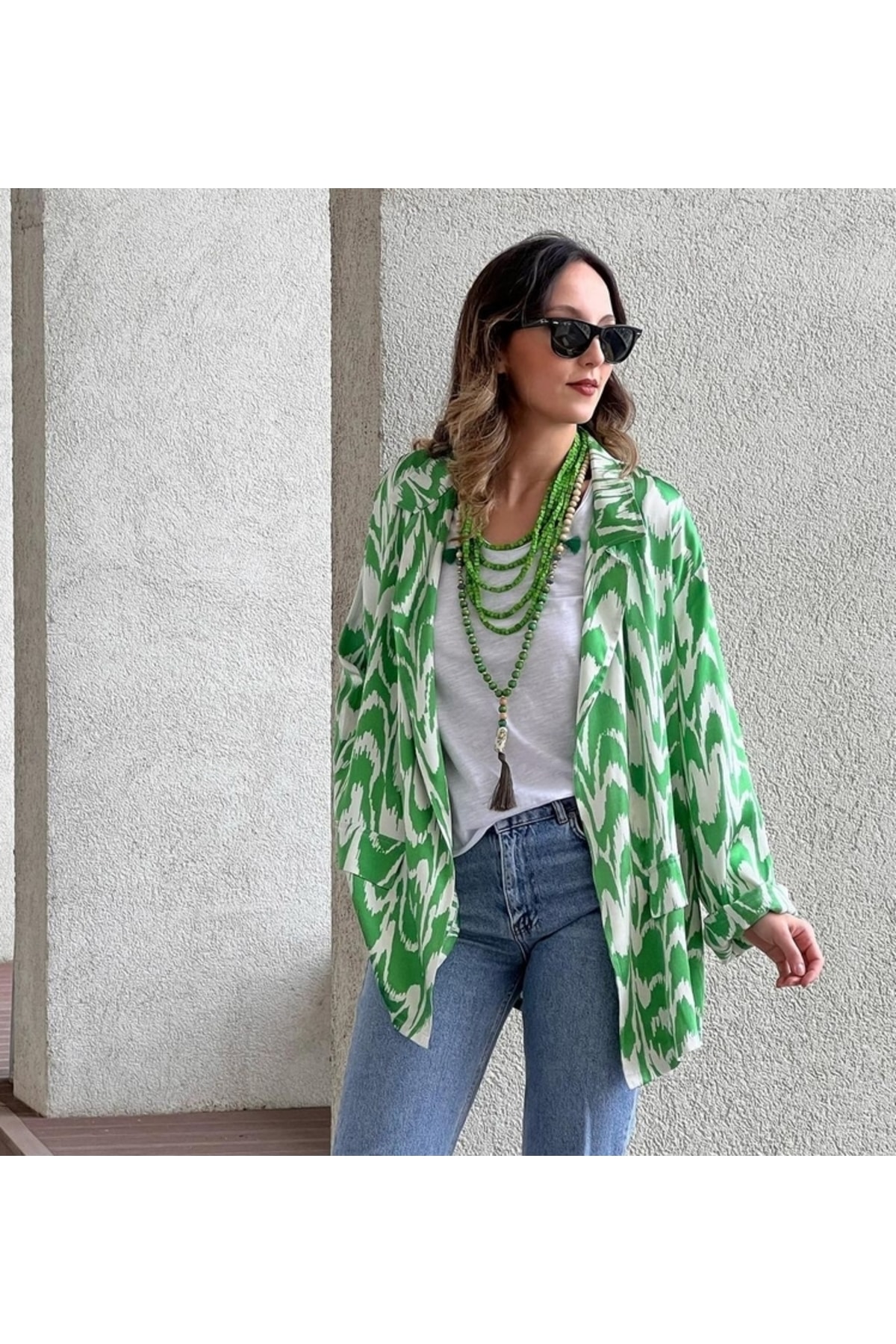 SATIN BLAZER JACKET PRODUCT LENGTH: 77 CM FABRIC: COTTON-SATEN SIZE: STANDARD COLOR: GREEN PATTERNED IT HAS A POCKET PICTURE BLAZER SATIN JACKET