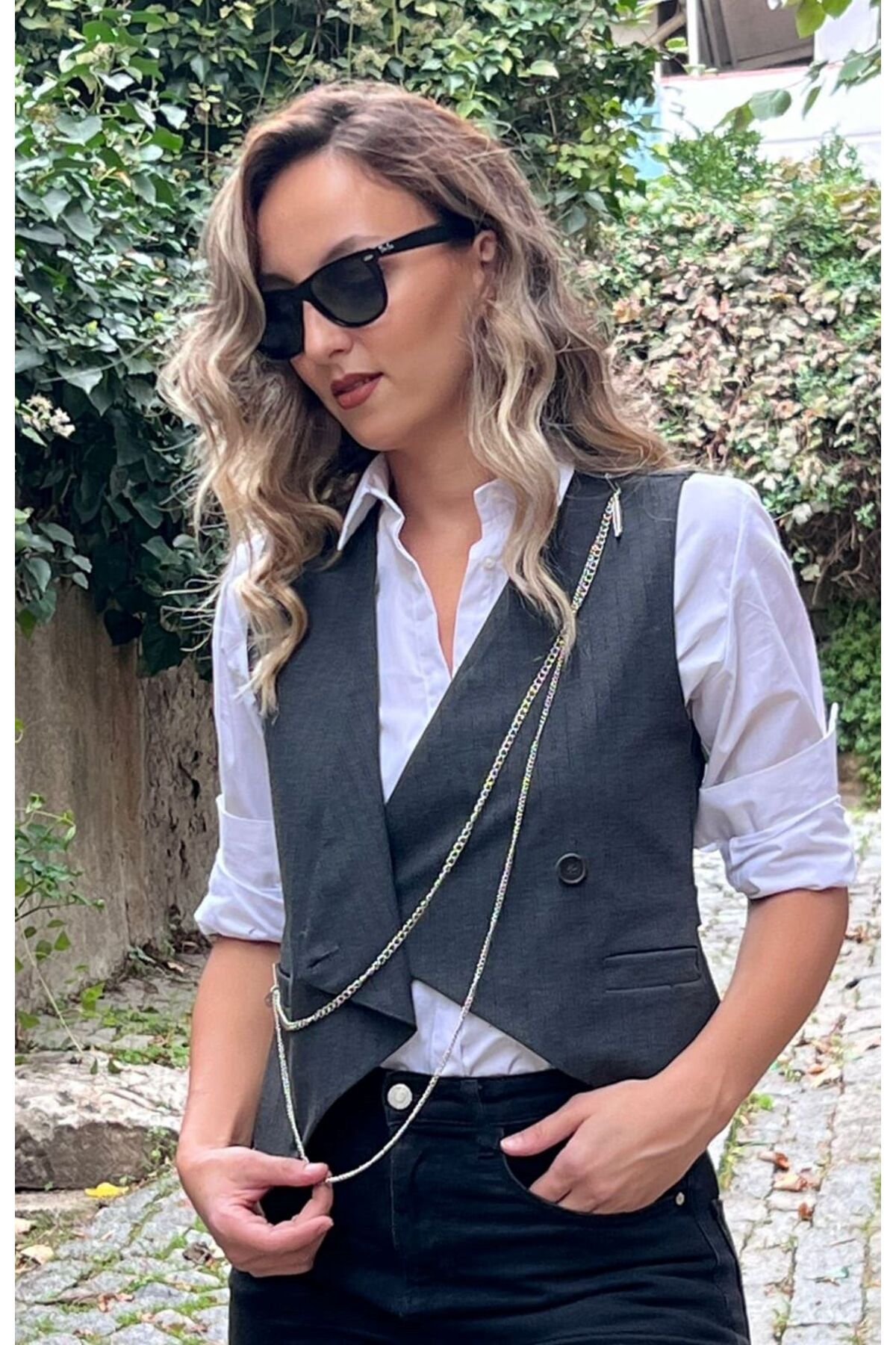 STRIPED CHAIN VEST COLOR: BLACK-GRAY-BROWN SIZE: 1-2-3, PRODUCT LENGTH: 50 CM IT HAS A POCKET VIEW ON THE FRONT AND A CROSSED REMOVABLE CHAIN ACCESSORY IT HAS NO POCKETS IT IS CLOSED WITH A BUTTON