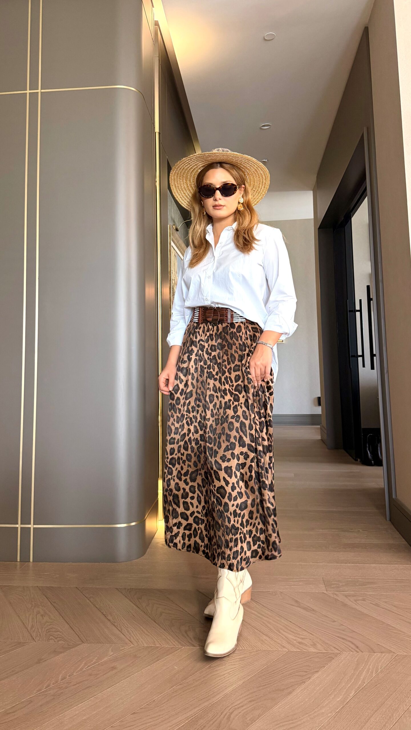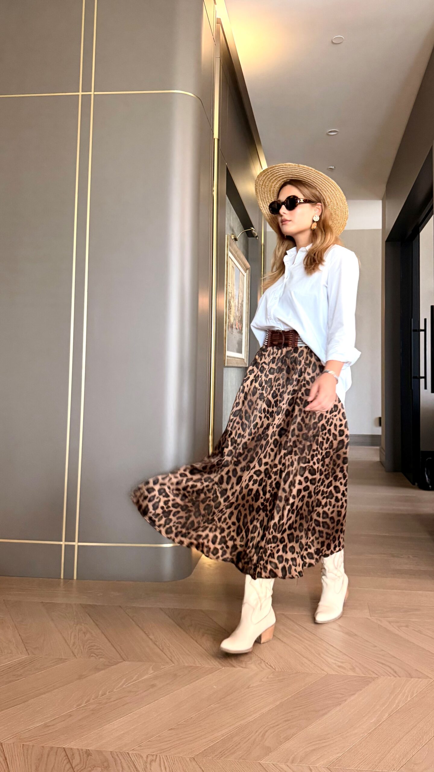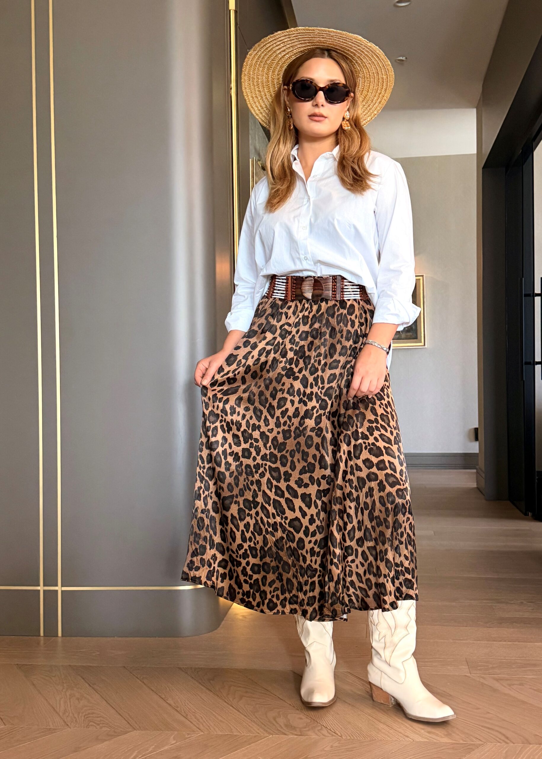 Feminine tasarım anlayışıyla öne çıkan leopar desenli etek, her gardıropta yerini almayı hak ediyor.; – Relaxed silueti ve bol kalıbı ile gün boyu rahat hareket etme imkanı sunar.; – Lastikli bel tasarımı sayesinde konforlu bir kullanım sağlar ve farklı vücut tiplerine uyum gösterir.; – Saten dokuma tipi ile zarif bir parlaklık ve yumuşak bir dokunuş hissi verir.; – Orta kalınlıkta saten kumaşı, mevsim geçişlerinde ideal bir tercih haline getirir.; – Gündüzden geceye her ortama uyum sağlayacak şıklığıyla dikkat çeker.; – Tüm sezonlar boyunca tercih edilebilen bu etek, yılın her zamanında stilinizi tamamlar.; – Kutulu gönderimiyle hem hediye olarak hem de kişisel kullanım için idealdir.; – Uzun boy kesimiyle feminen çizgileri ön plana çıkartırken, kemersiz tasarımı modern bir görünüm kazandırır.; – Yetişkinler için tasarlanmış olup, TR menşei garantisiyle kaliteli malzemeden üretilmiştir.; ÜRÜN BOY:87 CM BEDEN:S (36-38) UYUMLUDUR.