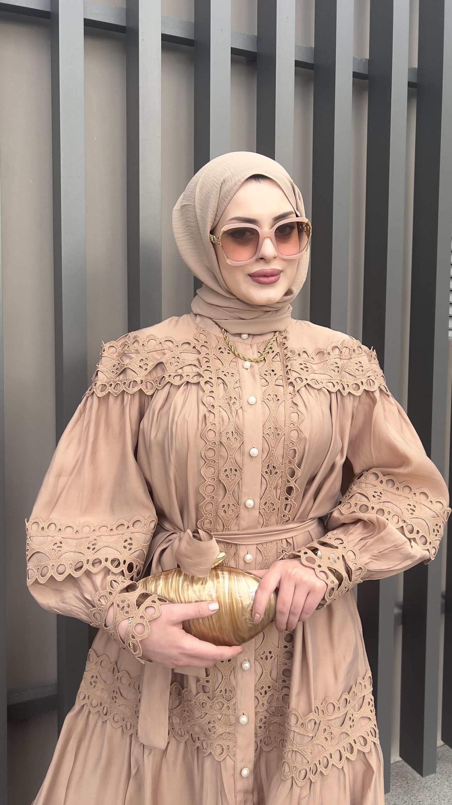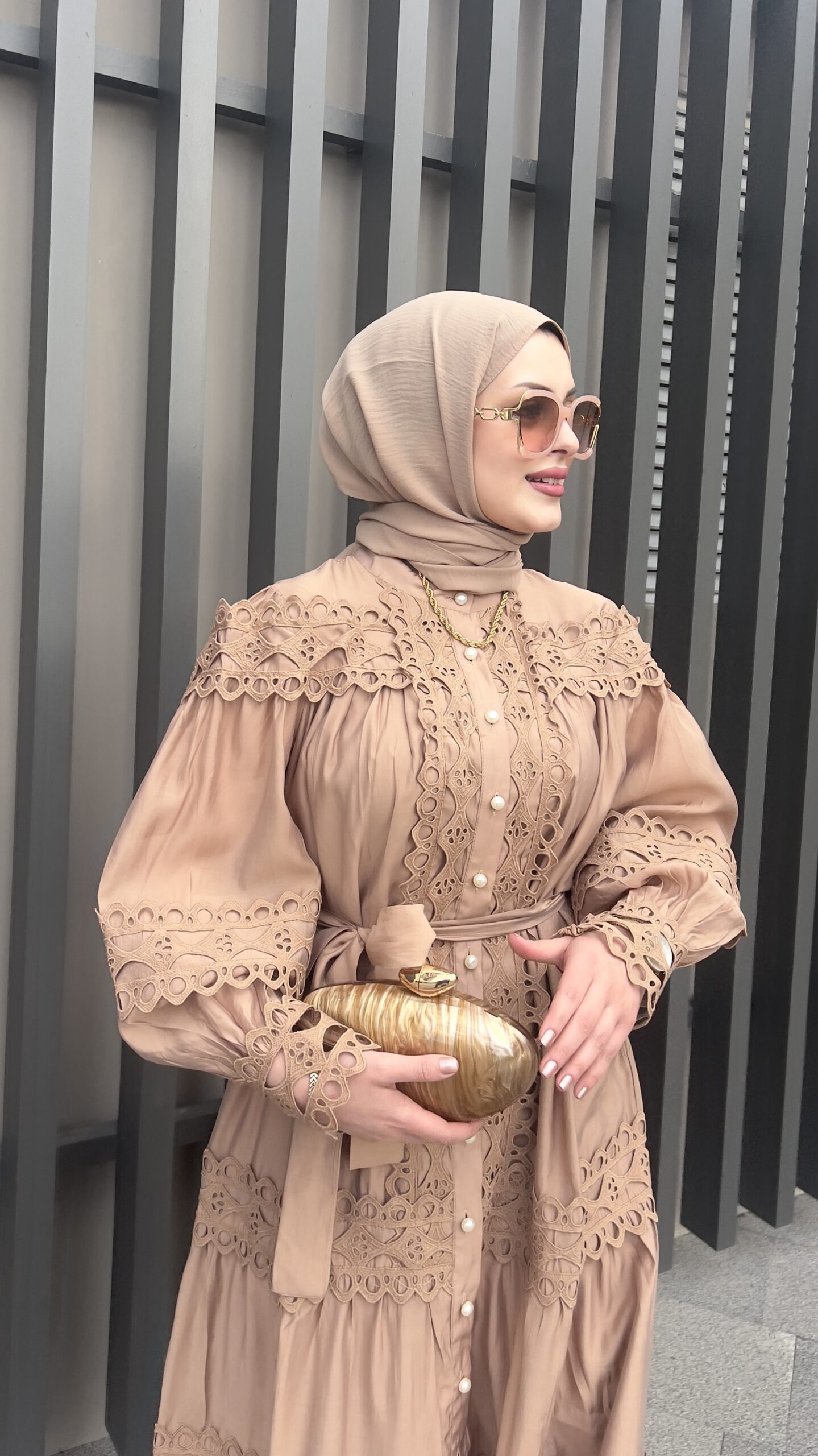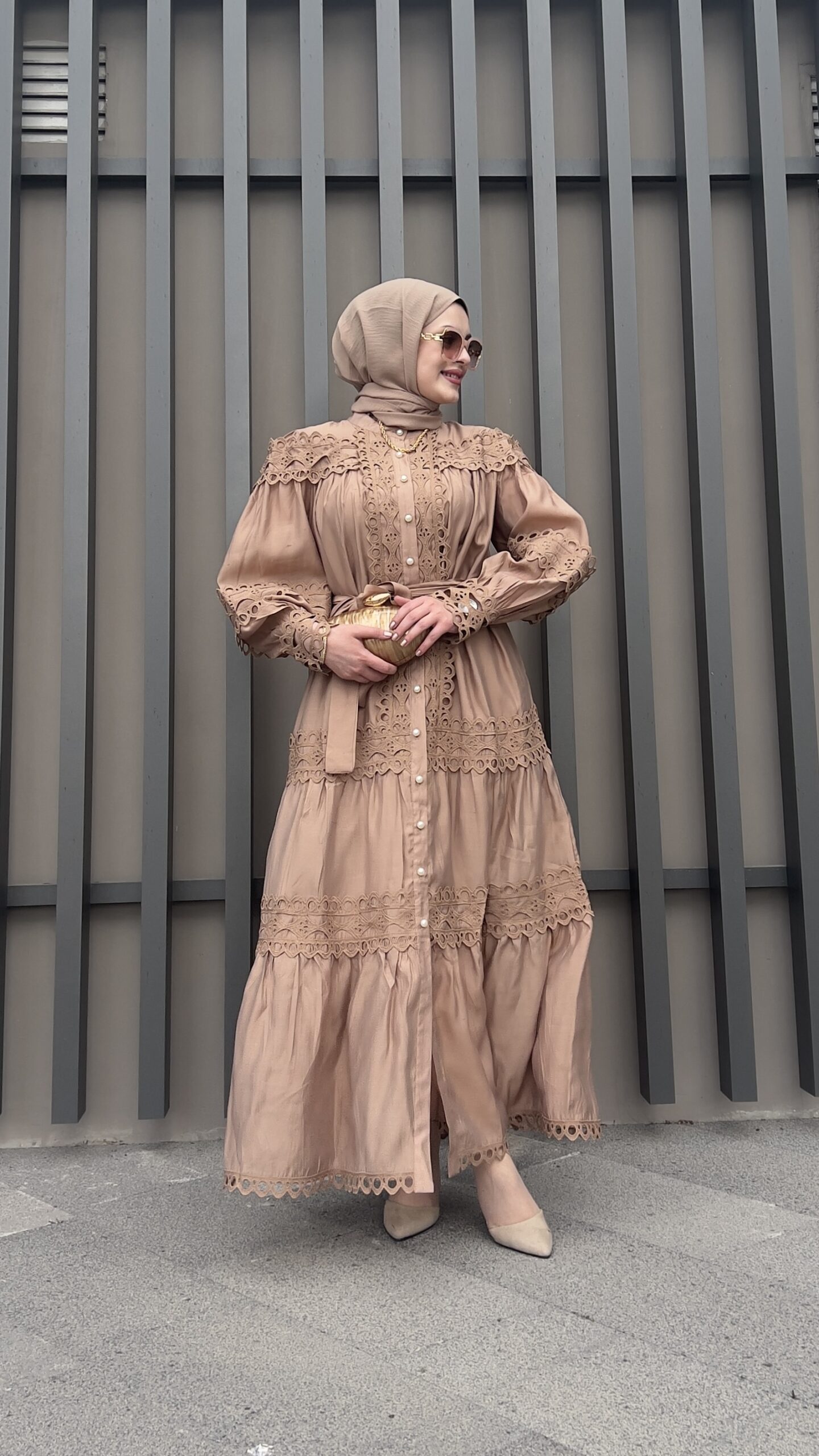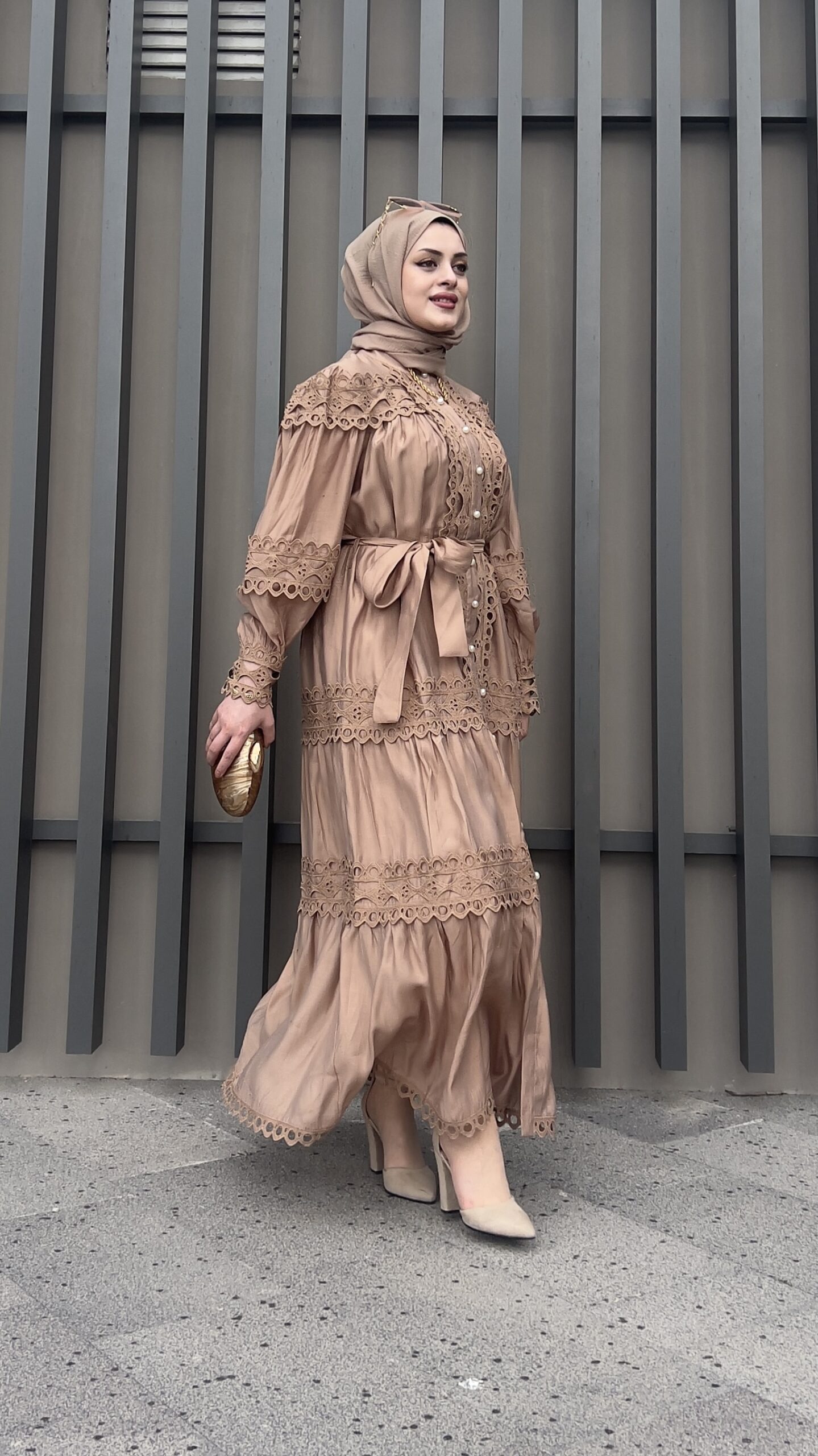 İNCİLİ DANTEL ELBİSE KAHVERENGİ