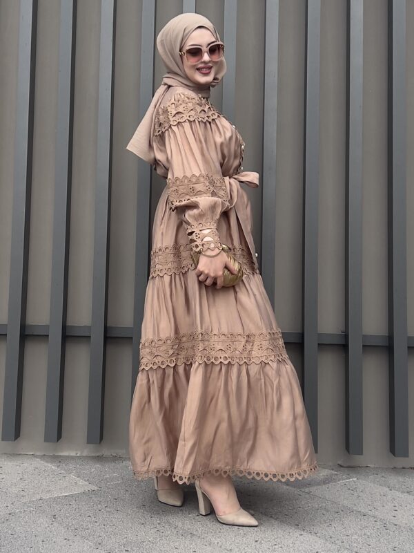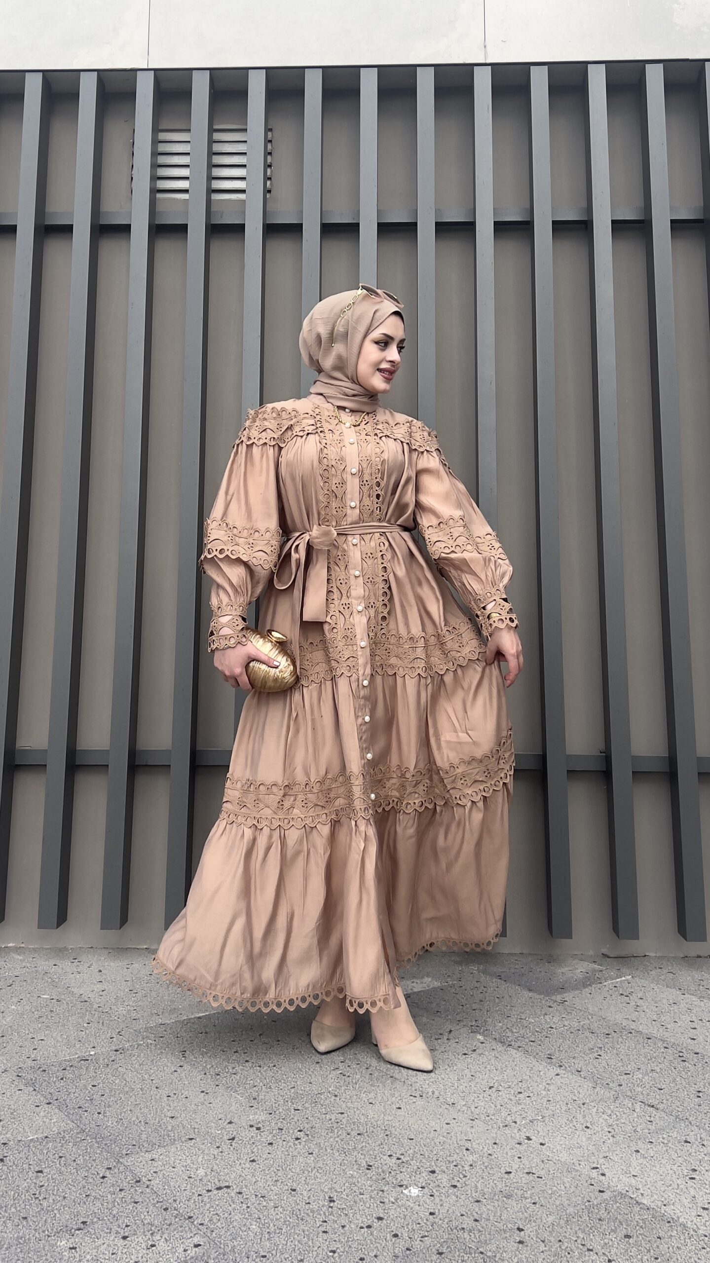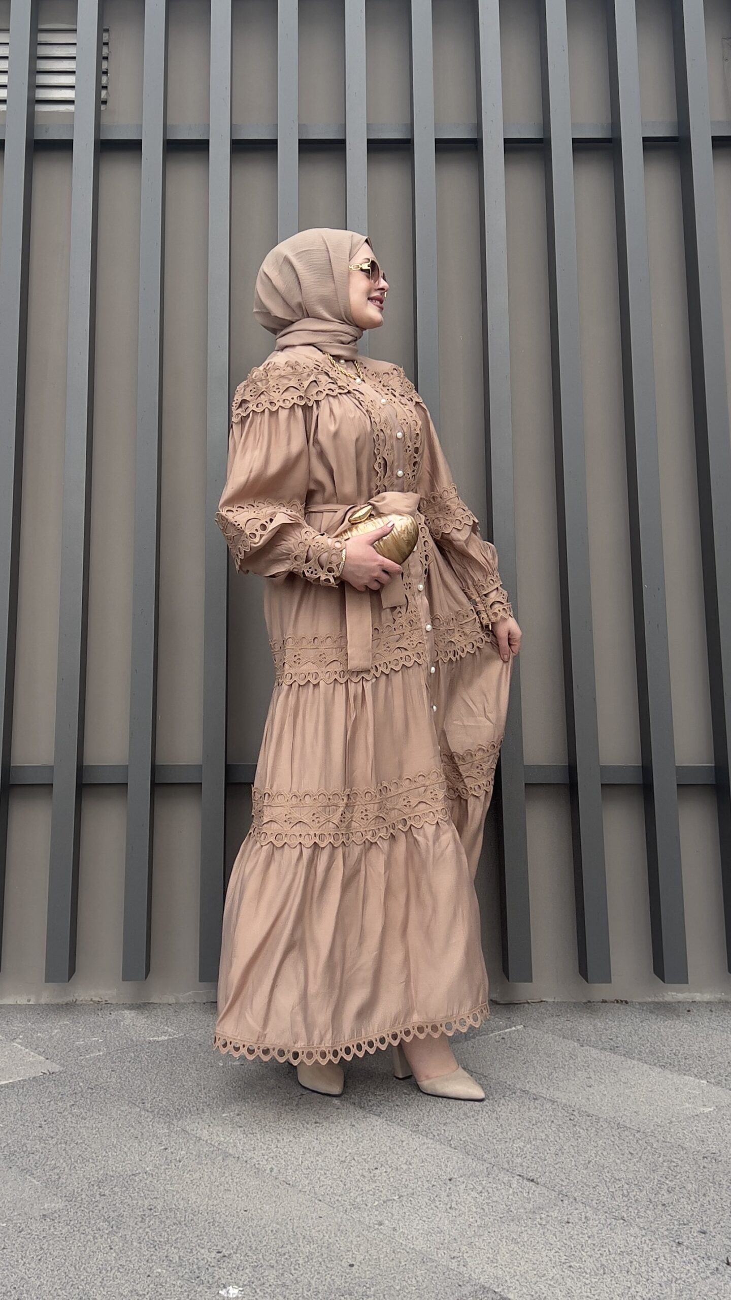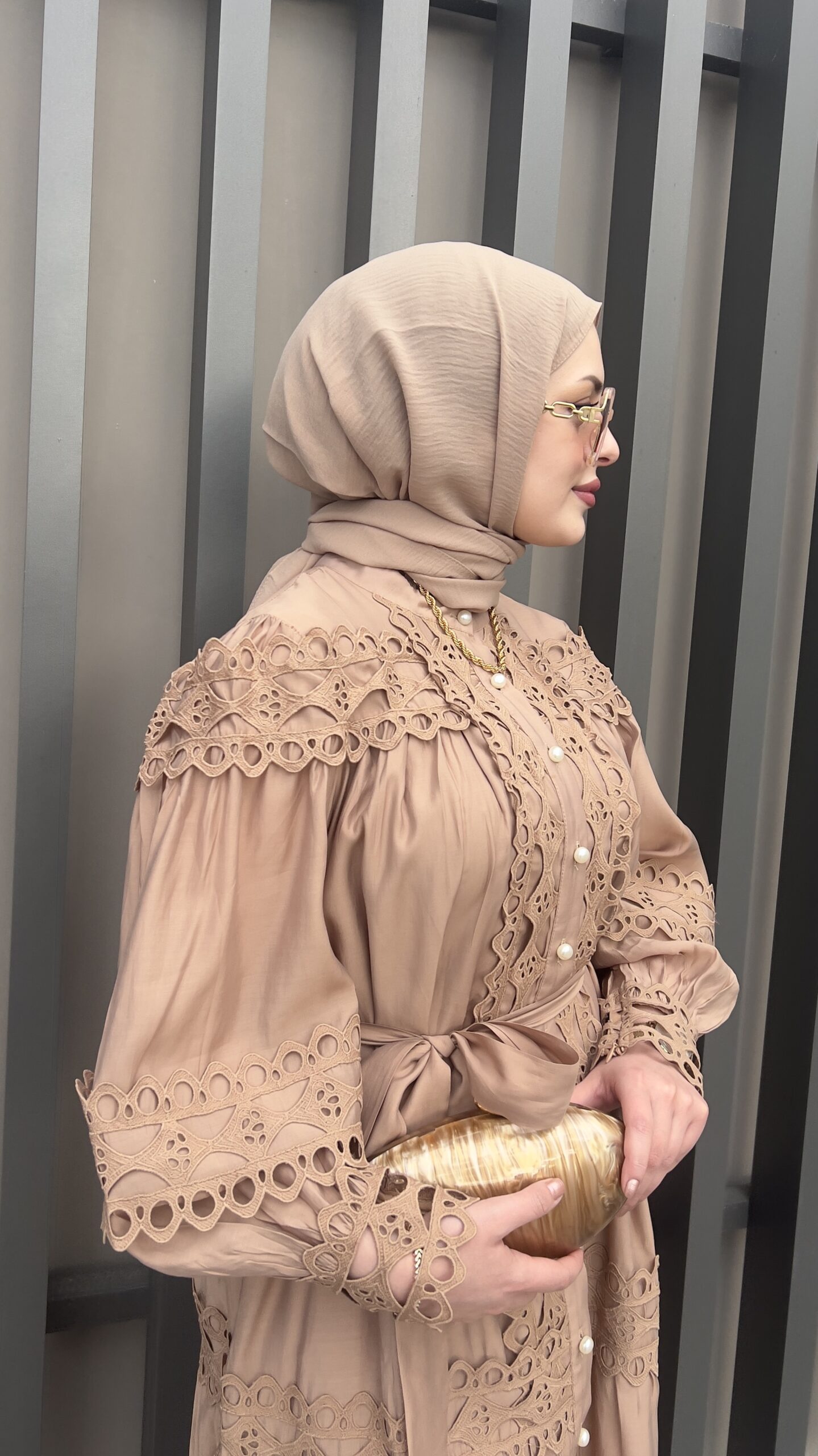 İNCİLİ DANTEL ELBİSE KAHVERENGİ