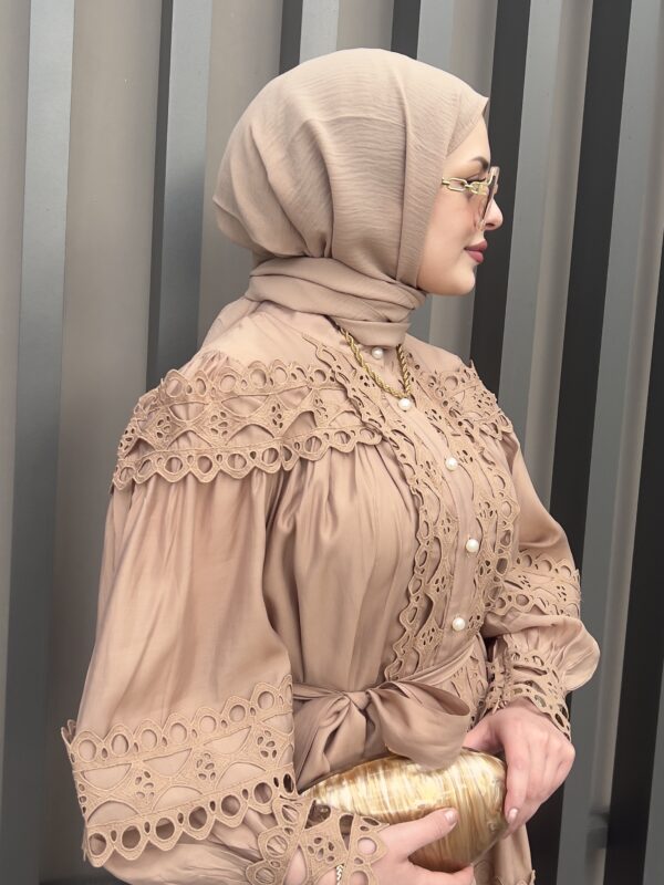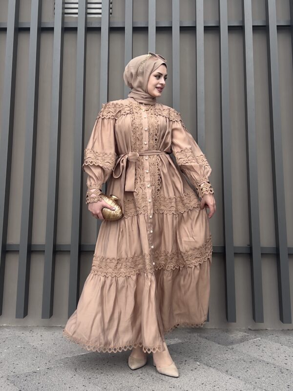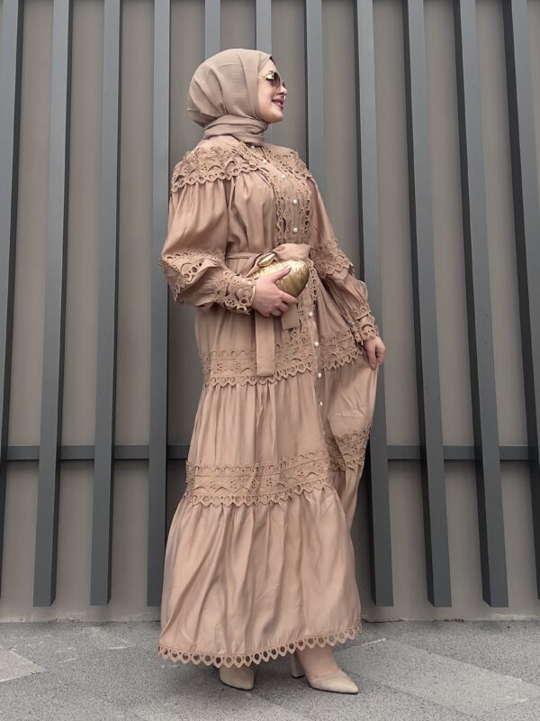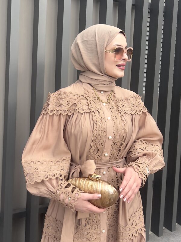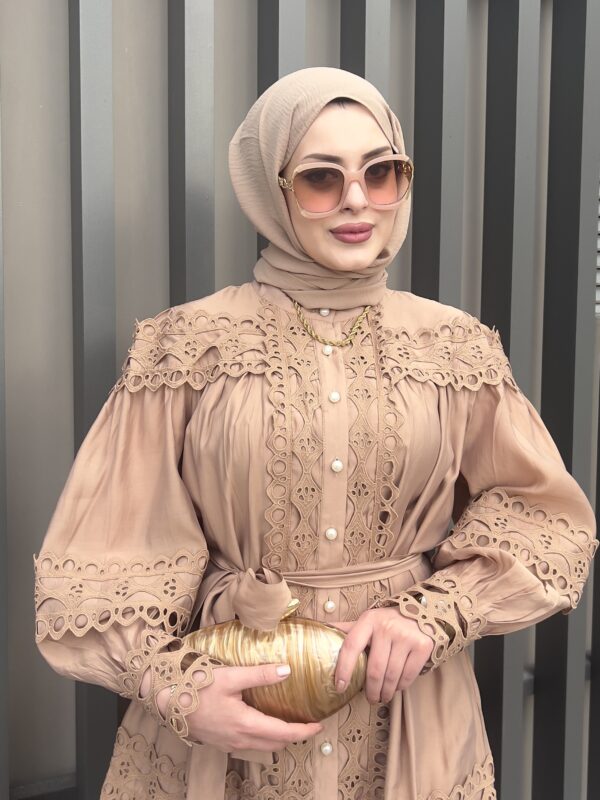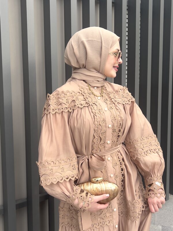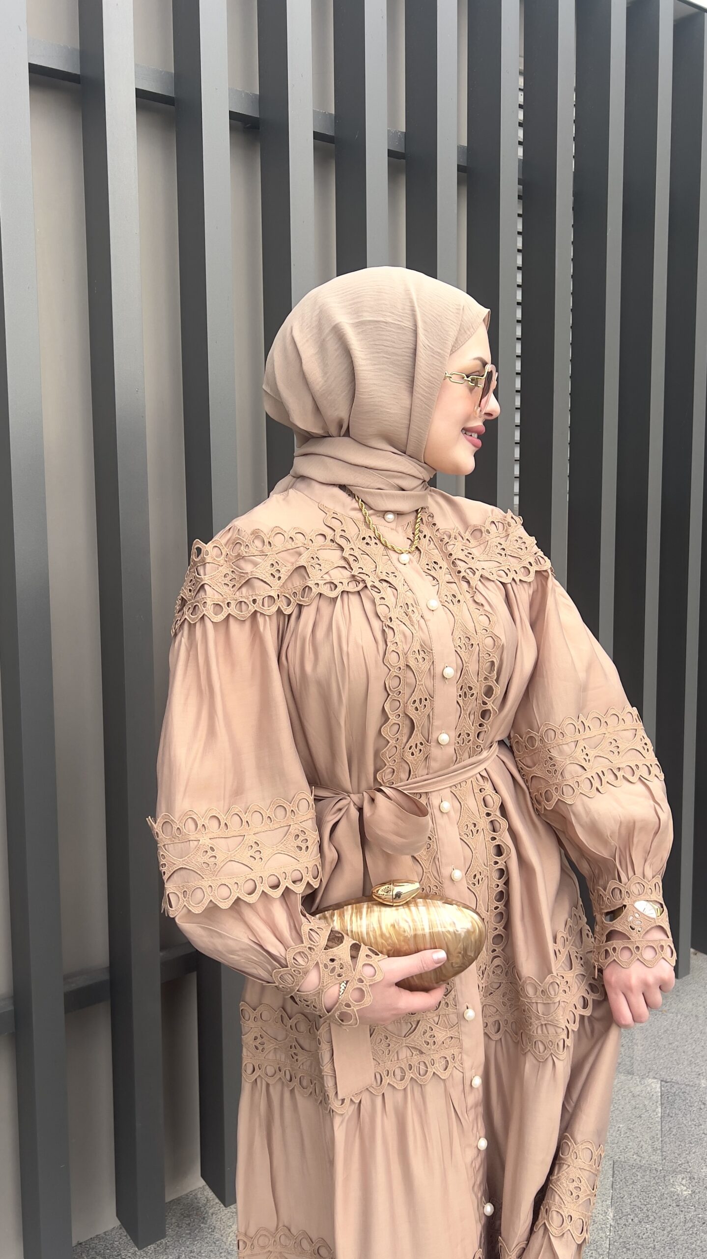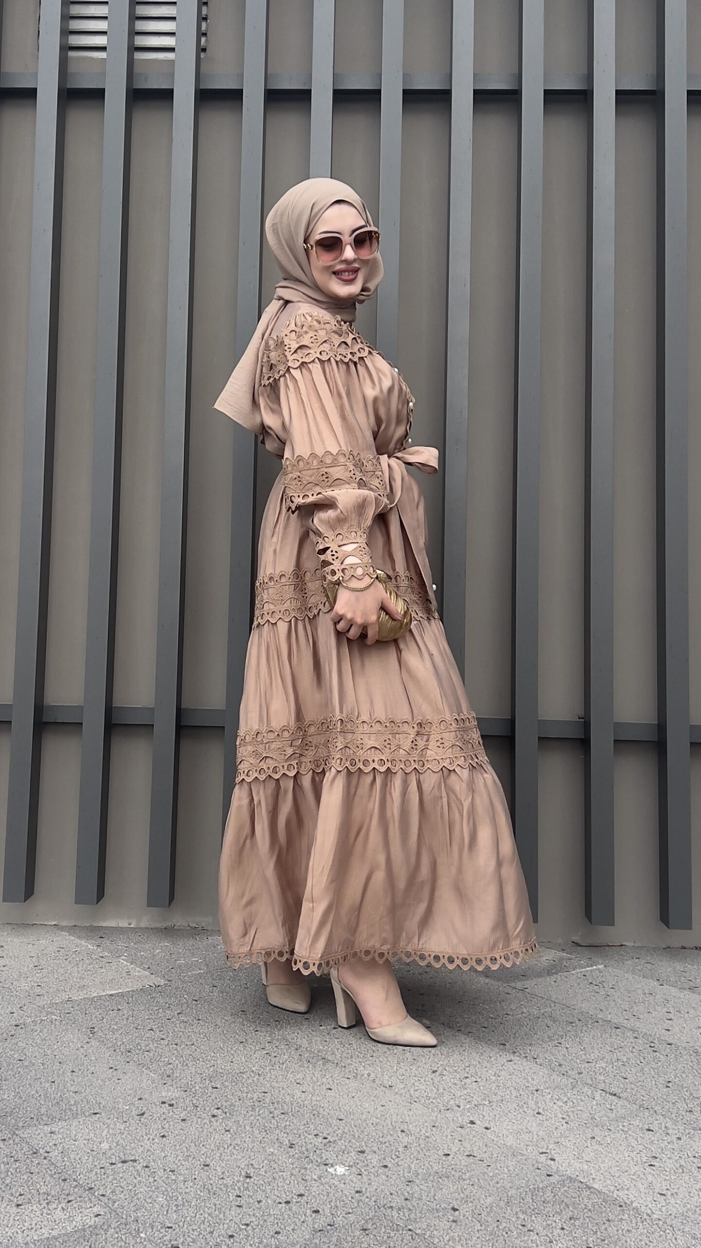 İNCİLİ DANTEL ELBİSE KAHVERENGİ