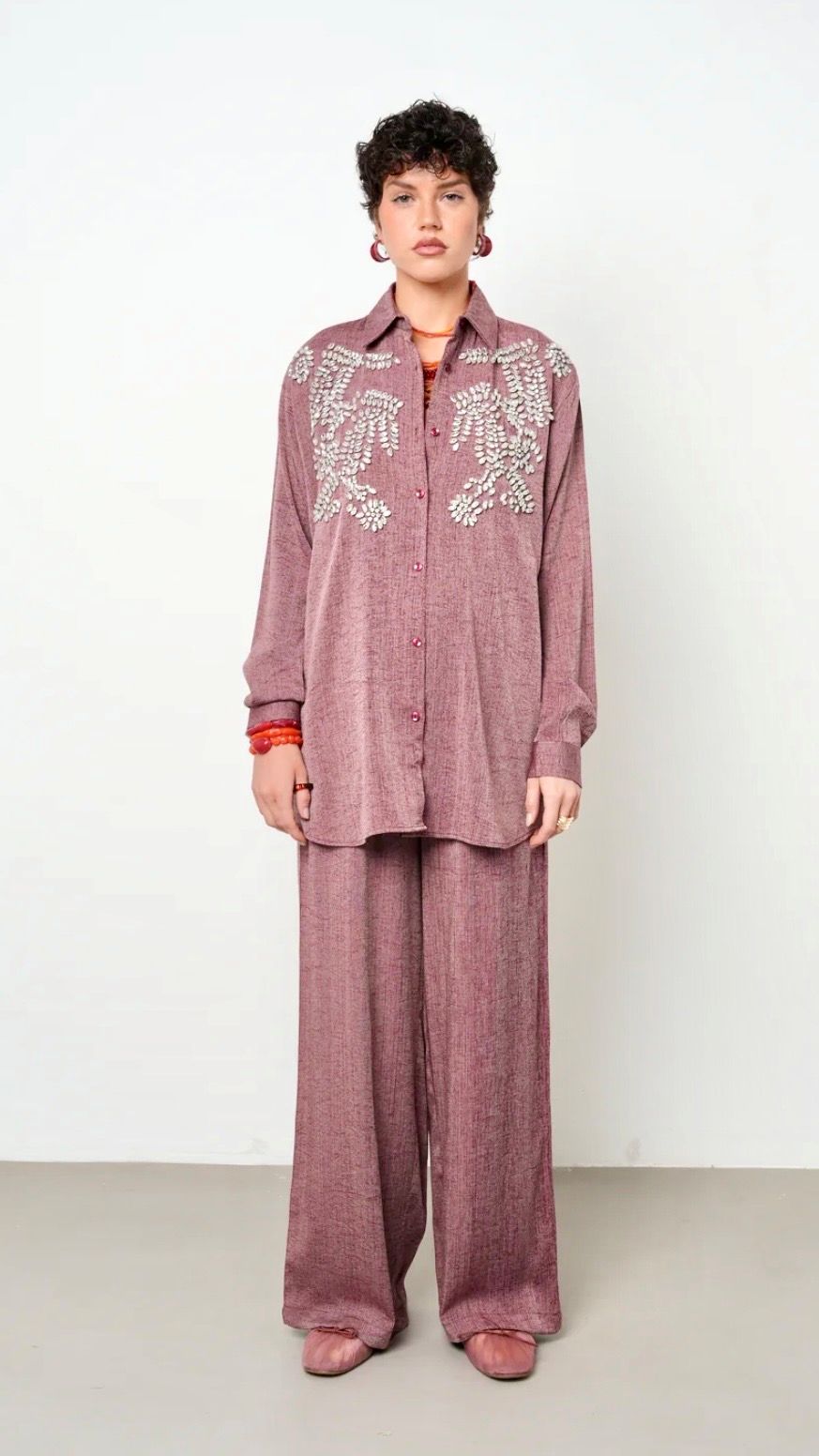 Sürdürülebilir üretim anlayışına uygun olarak tasarlanmış, çevre dostu bir seçenek sunar. – İki parçadan oluşan alt-üst takım, şıklığı ve rahatlığı bir arada sunar. – Kalın kumaş yapısı ile mevsim geçişlerinde ideal konfor sağlar. – Regular siluet, vücut hatlarınıza uyum sağlayarak rahat bir kullanım imkanı tanır. – Design koleksiyonunun özgün tasarımıyla dikkat çeken bu takım, stil sahibi kadınların tercihi olacak. – Kemersiz tasarımı sayesinde kolay kombin yapabilme avantajına sahiptir. – Uzun kollu gömlek yaka detayları ile hem gündüz hem de gece kullanımına uygunluk gösterir. – Boru paça pantolon ve düşük kol tasarımı modern bir görünüm kazandırırken, feminen çizgileri ön plana çıkarır. – Gizli cep detayları pratik kullanım sunarken, işlemeli ek özellikleriyle zenginleştirilmiş estetik bir dokunuş katmaktadır. – Tüm sezonlar için uygun materyal seçimiyle yılın her döneminde tercih edilebilir. – Ceket-pantolon kombinasyonu ile profesyonel ve şık,ÜRÜN BOY: GÖMLEK BOY: 76 CM PANTOLON BOY:105 CM,
